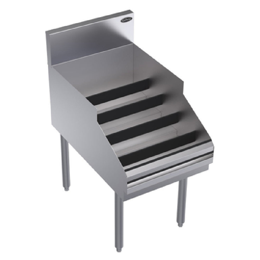 The Krowne KR29-18RD Royal Series Underbar Liquor Bottle Display Unit Freestanding is a meticulously engineered product designed for the hospitality and beverage industry. With dimensions of 18"W x 29"D, this unit is tailored to match the double speedrail depth, providing a seamless fit in a variety of bar settings. It is specifically constructed to accommodate up to 20 liquor bottles, distributed across 5 bottle steps with side splashes, ensuring organized and efficient bottle display and access. The robust construction features a stainless steel top, front, and sides, complemented by a galvanized steel back and bottom, which adds to its durability and resistance to corrosion. The inclusion of stainless steel legs with adjustable thermoplastic bullet feet allows for stability and customization on uneven surfaces. Furthermore, the unit is NSF certified, indicating its compliance with rigorous health and safety standards, making it a trusted choice for professional use. This display unit is ideal for bars, restaurants, and hospitality venues looking to optimize their underbar storage with a reliable and stylish option. Its comprehensive design not only enhances operational efficiency but also contributes to a sophisticated aesthetic in any bar environment.