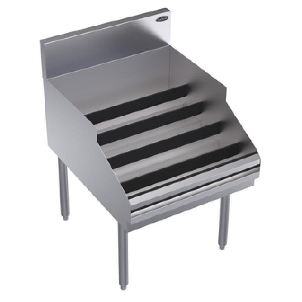 The Krowne KR29-24RD Royal Series Underbar Liquor Bottle Display Unit Freestanding is a high-capacity solution designed for efficient and organized beverage service environments. With dimensions of 24"W x 29"D, this display unit perfectly matches the depth of a double speedrail, making it a seamless inclusion in bar setups. This freestanding unit adeptly holds up to 28 liquor bottles, arranged on five bottle steps with side splashes, ensuring that bottles are both accessible and securely displayed. The unit's construction features a stainless steel top, front, and sides, paired with a galvanized steel back and bottom, providing robust durability and resistance to wear. The stainless steel legs are equipped with adjustable thermoplastic bullet feet, allowing for stability on uneven surfaces and adaptability to various underbar configurations. Certified by NSF, the Krowne KR29-24RD meets the rigorous standards for food safety and sanitation, making it a reliable choice for bars, restaurants, and hospitality venues looking to maintain high standards of service and presentation. This liquor bottle display unit is an ideal choice for establishments requiring an efficient, durable, and aesthetically pleasing solution for their underbar needs.