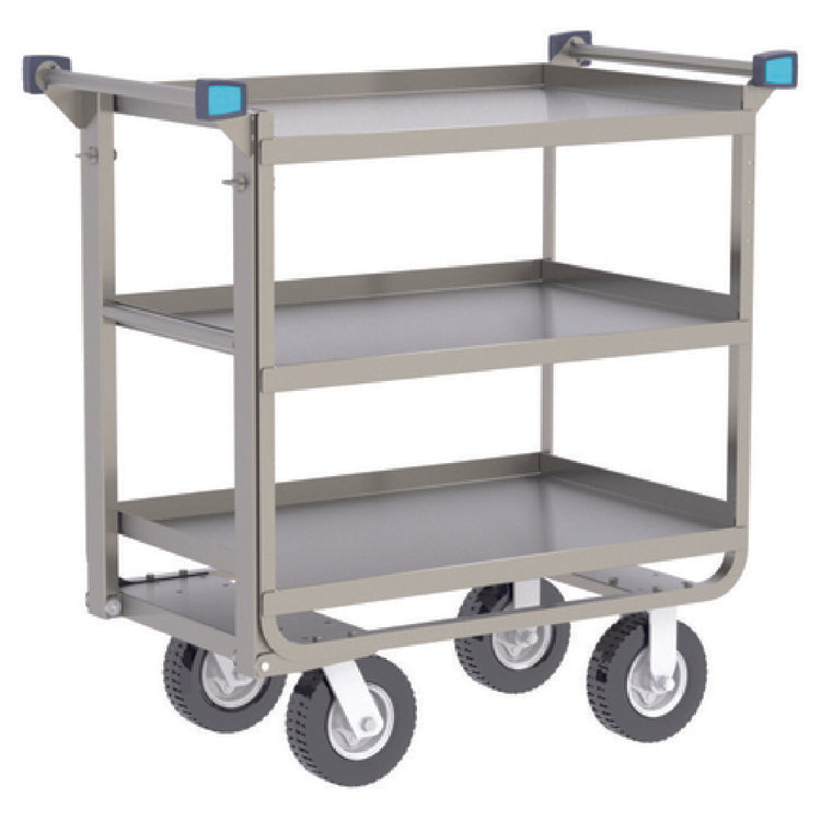 The Lakeside 155047 Multi-Terrain Mobility Cart is an expertly crafted utility cart designed to navigate a variety of environments with ease, making it a versatile asset across multiple industry sectors. This high-performance cart is equipped with three robust 21 x 33-inch shelves, providing ample storage space for various items. Its unique hinged push/pull handle allows for convenient maneuverability, catering to the dynamic needs of professionals in hospitality, healthcare, and industrial settings. Constructed from durable 18-gauge stainless steel, this cart ensures long-lasting reliability and resistance to wear and tear. The inclusion of top corner bumpers further enhances its protective features, safeguarding both the cart and surrounding environments from impact damage. Mobility is a key feature of the Lakeside 155047, thanks to its four 8-inch pneumatic casters, of which two are swivel casters with brakes for precise control, and two are fixed for stable directional movement. Proudly made in the USA, this cart embodies quality craftsmanship and is designed to meet the high standards required in demanding work environments, offering flexibility and efficiency through its thoughtful design and practical features.
