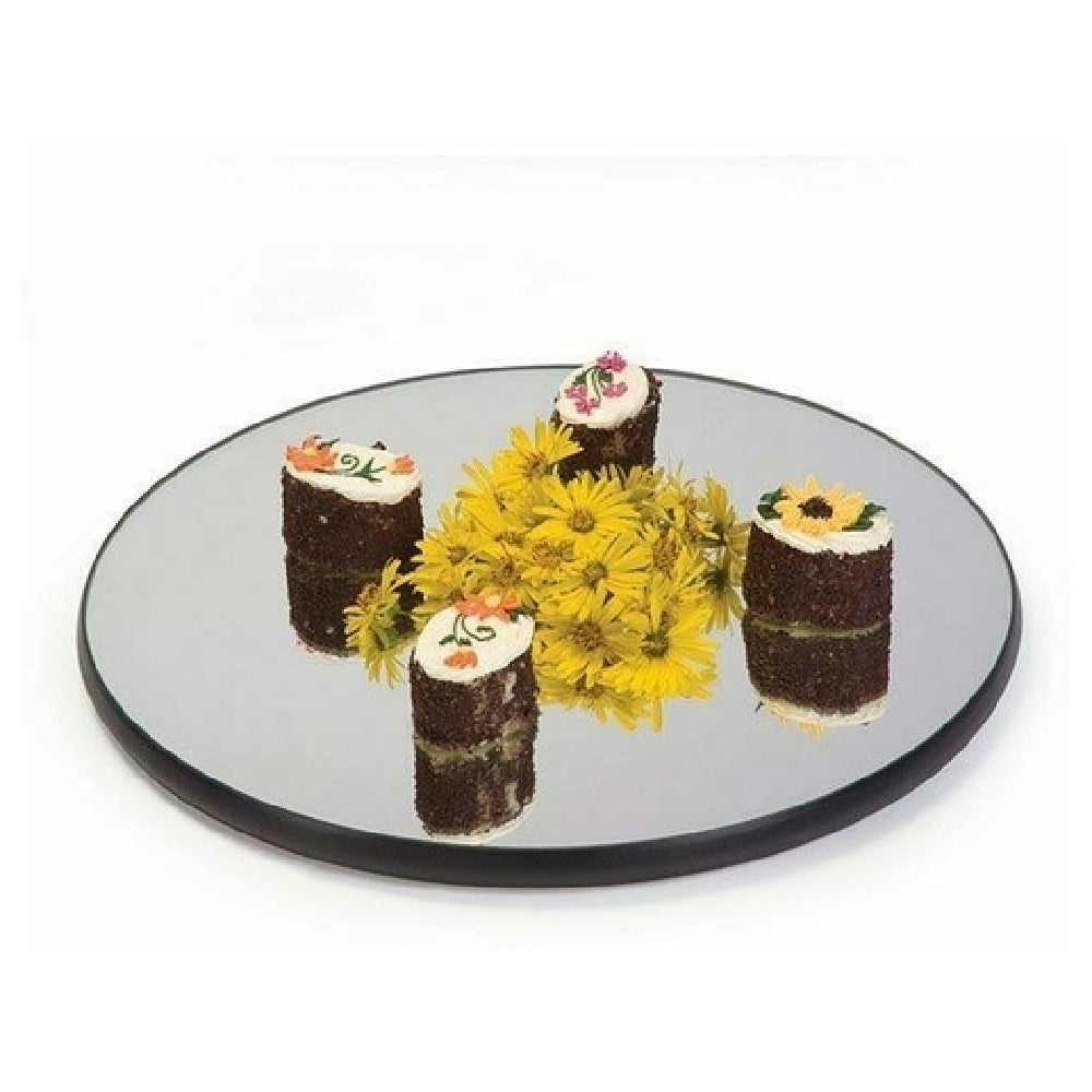 The Lakeside 2274 Mirror Tray Round 15" Diameter is a sophisticated serving accessory designed for both aesthetic appeal and practical functionality. This mirror tray features a 15-inch diameter, providing ample space for a variety of uses, such as presenting culinary creations or stylishly organizing personal items. The tray incorporates 9-inch clear acrylic legs, which elevate the mirror surface for an elegant display and enhanced visibility. Constructed with a 1/4-inch plate glass that is securely affixed to a wood backing, the tray ensures stability and durability. The black vinyl edges provide a sleek, modern finish, accentuating its minimalist, rimless design. Manufactured in the USA, the Lakeside 2274 Mirror Tray replaces the former Geneva # 2274 model, maintaining the same high standards of quality and craftsmanship. This versatile tray is ideal for use in restaurants, hotels, and catering services, where its refined appearance adds a touch of sophistication to any setting. Whether used in professional environments or personal spaces, the Lakeside 2274 Mirror Tray embodies a blend of practicality and elegance. Its robust construction and thoughtful design make it a valuable addition to any service or display application.