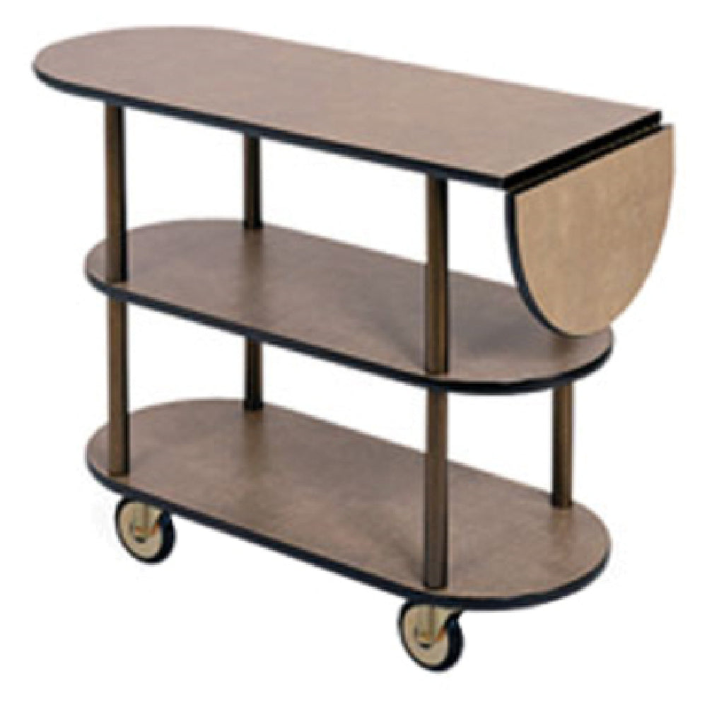 The Lakeside 36202_Cherry Service Cart Oval is a versatile and efficient solution for various service environments, featuring an elegant oval design with dimensions of 16"D x 48"W x 35-1/4"H. This service cart is equipped with three open shelves, providing ample space for storage and convenient access to items. The 10" drop leaf adds additional surface area, enhancing functionality without compromising on space-saving design. High impact edge molding ensures durability and resistance to wear, making it suitable for busy service settings. Constructed with 1-1/2" steel tube legs, this cart boasts stability and strength while maintaining a sleek appearance. The 4" swivel casters allow for easy maneuverability, making it ideal for smooth transportation across various surfaces. Proudly made in the USA, this service cart replaces the Geneva #36202 model, offering a modern take on a classic design. Its combination of practical features and refined aesthetic makes the Lakeside 36202_Cherry Service Cart Oval an appealing choice for restaurants, hotels, and catering services that require reliable and stylish serving solutions.