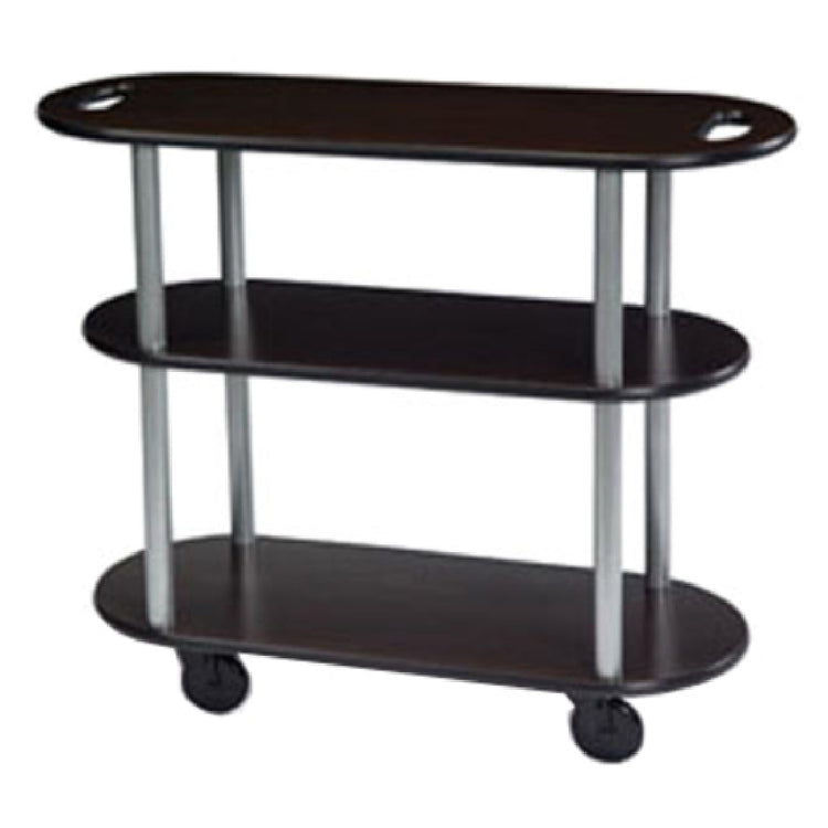The Lakeside 36204_BLACK Service Cart is an expertly crafted oval cart with dimensions of 16"D x 39"W x 35"H, providing a practical and efficient solution for various service needs. Featuring three open shelves, this cart allows for seamless organization and access to essential items. The inclusion of handle hole cutouts on the top enhances maneuverability, making it easy to steer in busy environments. Built for durability, the cart is constructed with high-impact edge molding and supported by 1-1/2" steel tube legs, ensuring stability and longevity. Equipped with 4" swivel casters, it offers smooth and effortless movement across different surfaces. Proudly made in the USA, this service cart supersedes the Geneva # 36204 model, reflecting its enhanced features and reliability. The Lakeside 36204_BLACK Service Cart is an indispensable asset in various market segments within the hospitality and service industries, where mobility, durability, and efficient storage are paramount. Its robust design and practical features cater to the demands of busy kitchens, hotels, and event spaces, solidifying its place as a versatile and essential tool for professionals seeking quality equipment to enhance their operations.