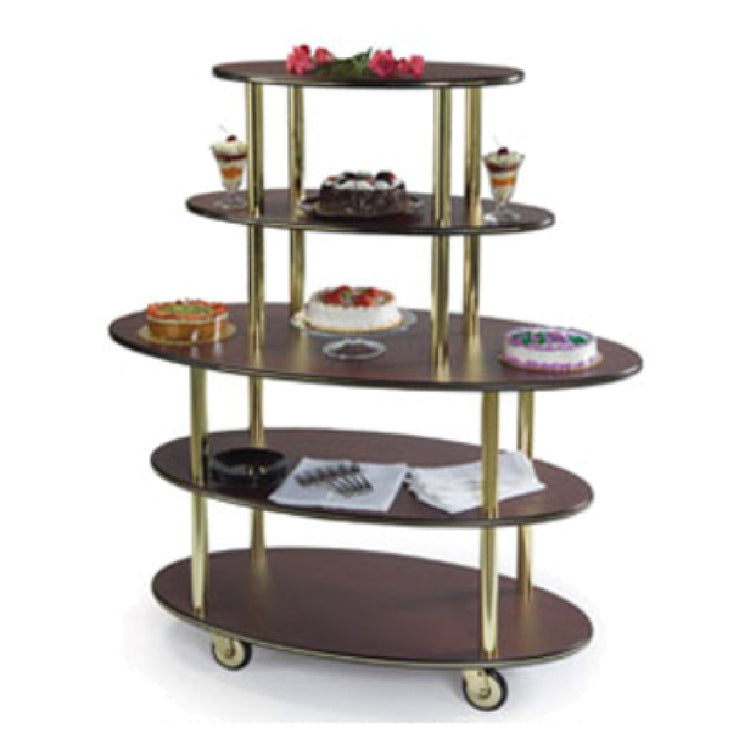 The Lakeside 37212_BLACK Dessert Cart is a versatile and robust solution for food service establishments seeking efficient and stylish mobile storage. Featuring a distinctive rounded oval design, this cart measures 50 inches in width, 24 inches in depth, and 57 inches in height. It comes equipped with five open shelves, providing ample space for displaying and transporting a variety of desserts and other culinary items. The high-impact edge molding ensures durability, enhancing the cart's ability to withstand the rigors of daily use in a busy kitchen or catering environment. Supported by sturdy 1-1/4 inch steel tube legs, the cart promises stability and reliability. Its 5-inch swivel casters facilitate smooth maneuverability, making it an ideal choice for dynamic service scenarios. Proudly made in the USA, the Lakeside 37212_BLACK Dessert Cart is designed to replace the Geneva #37212 model, offering an upgraded experience for professional chefs and food service providers. This cart's combination of aesthetic appeal and practical functionality makes it a valuable asset for a diverse range of market segments within the hospitality industry, from high-end restaurants to large-scale catering operations, where both presentation and performance are critical.