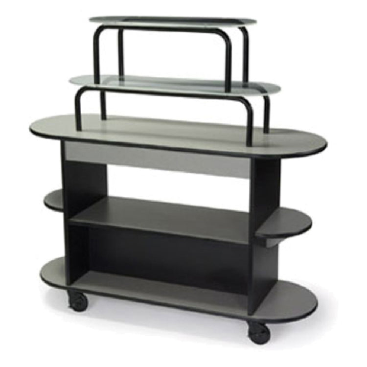 The Lakeside 37218_Red Maple Dessert Cart - a versatile and practical solution for dessert service in hospitality environments - features a rounded oval design measuring 20"D x 55"W x 54"H. It is engineered with three open shelves, providing ample space for displaying and serving a variety of desserts. Complementing this are two acrylic overshelves, perfect for showcasing additional items, while the open side shelves offer extra convenience and accessibility. The cart is designed with high impact edge molding to enhance its durability and longevity in busy settings. Its sturdy 1-1/2" steel tube legs ensure stability, even when fully loaded. Equipped with 4" swivel casters, this cart offers exceptional maneuverability, allowing for easy transport across different service areas. Made in the USA, the Lakeside 37218_Red Maple Dessert Cart replaces the previous Geneva model #37218, ensuring continuity in quality and service. Its combination of functional design and durable construction makes it an ideal choice for restaurants, hotels, and catering services looking to enhance their dessert presentation and service capabilities.