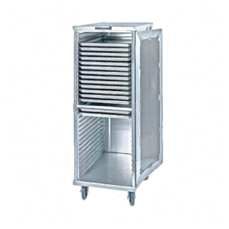 The Lakeside 5531 Transport/Delivery Cabinet Enclosed 68"H is a meticulously crafted solution for transporting and delivering large quantities of sheet pans with precision and ease. This cabinet boasts a substantial capacity, accommodating up to 40 sheet pans measuring 18" x 26" each, making it an essential asset for commercial kitchens and food service operations. The cabinet's interior features extruded aluminum ledges with 1-1/2" spacing, designed to securely hold the pans in place during transport. The solid door is equipped with a positive gravity catch, ensuring contents remain securely enclosed. Constructed from durable aluminum, the cabinet is engineered for longevity and reliability. The unit is mounted on welded-on swivel plate casters with 5" non-marking polyurethane wheels, facilitating smooth and quiet mobility across various surfaces. This cabinet is NSF certified, reflecting its compliance with high standards of public health and safety. Made in the USA, the Lakeside 5531 Transport/Delivery Cabinet is an exceptional choice for catering companies, hospitals, and institutions needing efficient and safe transport of food items, combining functionality with robust construction.