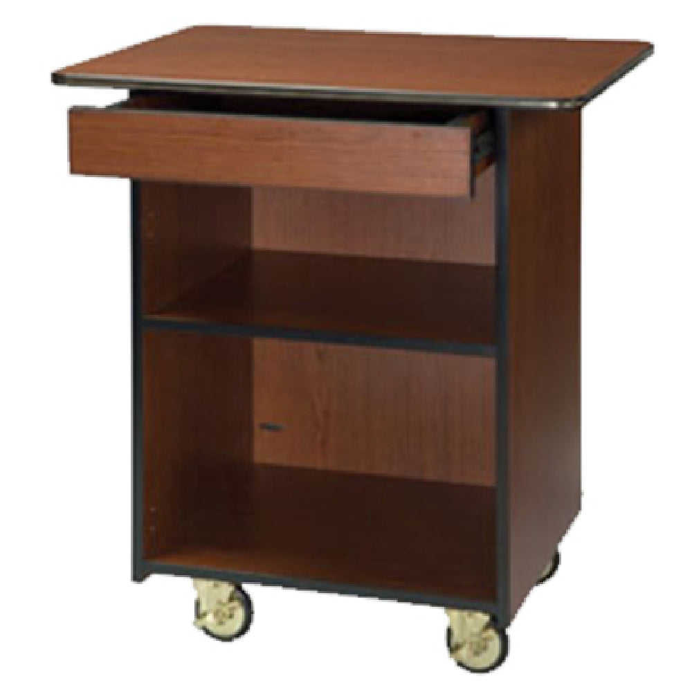The Lakeside 66107 Compact Service Cart is a robust enclosed unit designed for efficient service operations, featuring dimensions of 25-1/2"D x 33-1/2"W x 36-3/4"H overall, with an interior depth of 23". This cart is engineered with a single compartment and a fixed shelf, offering practical storage solutions for diverse industry needs, such as healthcare, hospitality, and catering services. It includes a convenient drawer, enhancing its utility by providing easy access to essential items. Constructed with high-impact edge trim and laminate, it ensures durability and a long lifespan, making it a reliable choice for high-demand environments. The cart is equipped with 4" swivel casters, promoting effortless mobility even in tight spaces. Proudly made in the USA, the Lakeside 66107 replaces the Geneva # 66107 model, maintaining its commitment to quality and innovation. Its compact design and efficient storage features cater to the unique requirements of various market segments, from healthcare facilities needing organized supply transport to hospitality venues requiring sleek, mobile service stations. The Lakeside 66107 Compact Service Cart is an exemplary embodiment of practical design and robust construction, tailored to meet the dynamic demands of modern service industries.