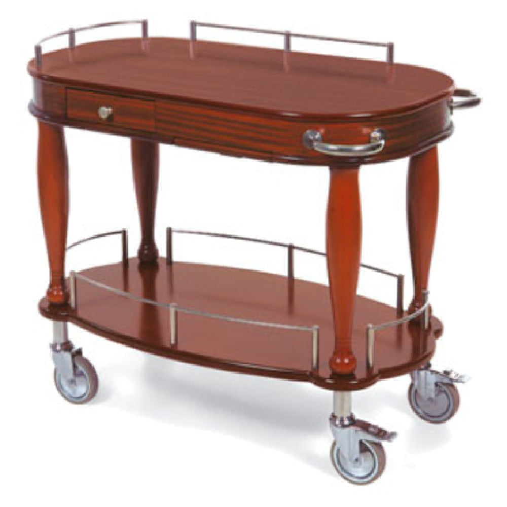 The Lakeside 70011 Serving Cart-Bordeaux is a versatile piece designed for both functionality and aesthetic appeal, measuring 21-5/8"D x 39-3/8"W. It features an oval-shaped top and is crafted with solid beech wood legs, which are stained and varnished for a sophisticated finish. This serving cart includes a pull-out shelf on the end and three drawers, providing ample storage space for various applications. Its wood veneer overlay construction is complemented by a satin varnish finish, enhancing both durability and style. For ease of movement, the cart is equipped with 5" plastic core wheels with a non-marking bonded rubber exterior, two of which include brakes for added stability. The 304 stainless handles and rails offer a sleek, modern contrast and ensure reliable, long-term use. This serving cart is ideal for settings requiring efficient service, such as hospitality events, restaurants, and catering services, where its robust design and practical features can be fully utilized. It replaces the previous Geneva #70011 model, offering an upgraded experience for users across diverse market segments within the industry.