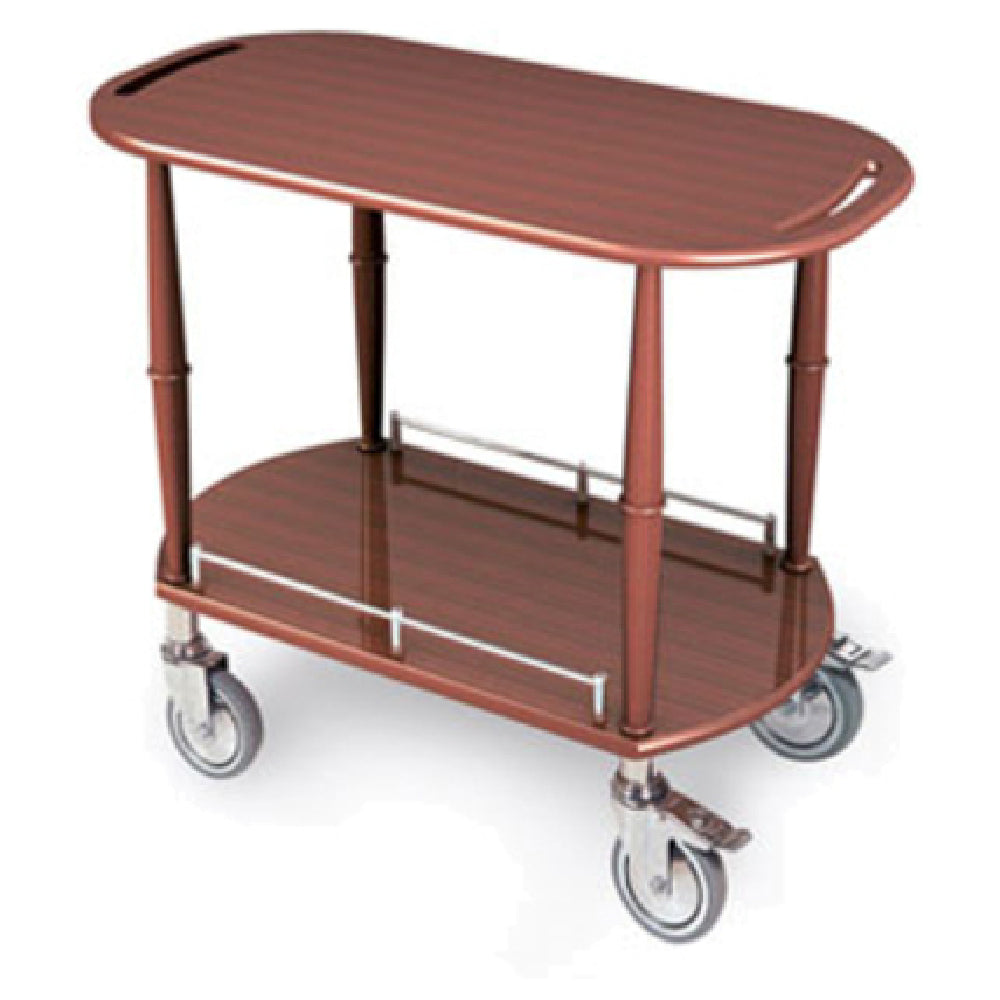 The Lakeside 70524 Serving Cart-Spice is a versatile and functional addition to any hospitality setting, measuring 17-3/4"D x 35-1/2"W x 32-1/4"H with an elegant oval shaped top. This serving cart is expertly crafted with a wood veneer overlay construction highlighted by a satin varnish finish, combining aesthetic appeal with durability. It features one sturdy shelf, providing ample space for transporting meals or supplies, and handle cut-outs on the top shelf for easy maneuverability. The inclusion of 304 stainless steel rails ensures added strength and longevity, making it ideal for high-traffic environments. The 5" chrome wheel tops are equipped with non-marking bonded rubber exteriors to protect flooring surfaces, while two of the wheels include brakes for secure stationary positioning. This model effectively replaces the Geneva # 70524, offering an improved design and functionality. The Lakeside 70524 Serving Cart-Spice is designed to cater to diverse market segments such as high-end hotels, restaurants, or catering services, providing a unique blend of style, practicality, and reliability, suitable for both front-of-house and back-of-house applications. Its thoughtful design and robust construction make it an indispensable tool for professionals in the hospitality industry.