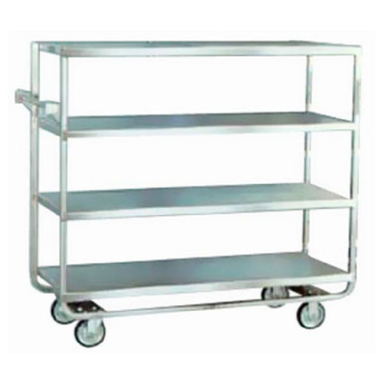The Lakeside 761 Open Tray Truck is a versatile and robust solution designed for efficient material handling in various industrial and commercial settings. This truck features a stainless steel construction, ensuring durability and resistance to corrosion, crucial for environments that demand high standards of hygiene and longevity. With its four shelves, each measuring 49 inches in width and 21 inches in depth, the Lakeside 761 provides ample storage space for diverse items. The configuration includes three shelves with edges up and one with the edge down, accommodating different storage needs and preventing items from sliding off during transportation. The 11-inch clearance between shelves allows for the storage of taller items. Equipped with a push handle for easy maneuverability, the truck supports a substantial weight capacity of up to 700 pounds, making it suitable for heavy-duty use. Mobility is enhanced by two 5-inch swivel casters and two 5-inch fixed casters, which facilitate smooth movement across various surfaces. Proudly manufactured in the USA, the Lakeside 761 Open Tray Truck embodies quality craftsmanship and reliability, making it an indispensable tool for efficient operations in industries ranging from hospitality to healthcare, where material transport and organization are paramount.