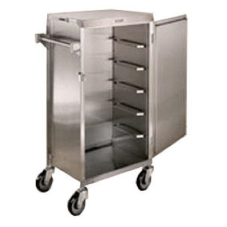 The Lakeside 854 Tray Delivery Cart is a meticulously designed piece of equipment with a 6-tray capacity, ideal for institutions needing efficient meal transport solutions. It features 6-inch ledge spacing, accommodating a maximum tray size of 16" x 22" and a minimum tray size of 14" x 18", catering to a variety of tray dimensions common in healthcare and food service industries. The cart's stainless steel exterior ensures durability and ease of cleaning, making it suitable for environments requiring stringent hygiene standards. A removable door provides flexibility and accessibility, an asset in facilities with high turnover meal service. Equipped with 5-inch swivel polyurethane wheels, the cart promises smooth mobility across different floor types, enhancing operational efficiency. Certified by the NSF, this cart meets essential public health and safety standards, reflecting its reliability for professional use. Proudly made in the USA, the Lakeside 854 Tray Delivery Cart combines quality construction with practical design, serving as a valuable component in hospitals, catering services, and institutional dining setups, where dependable transport of meals is crucial.