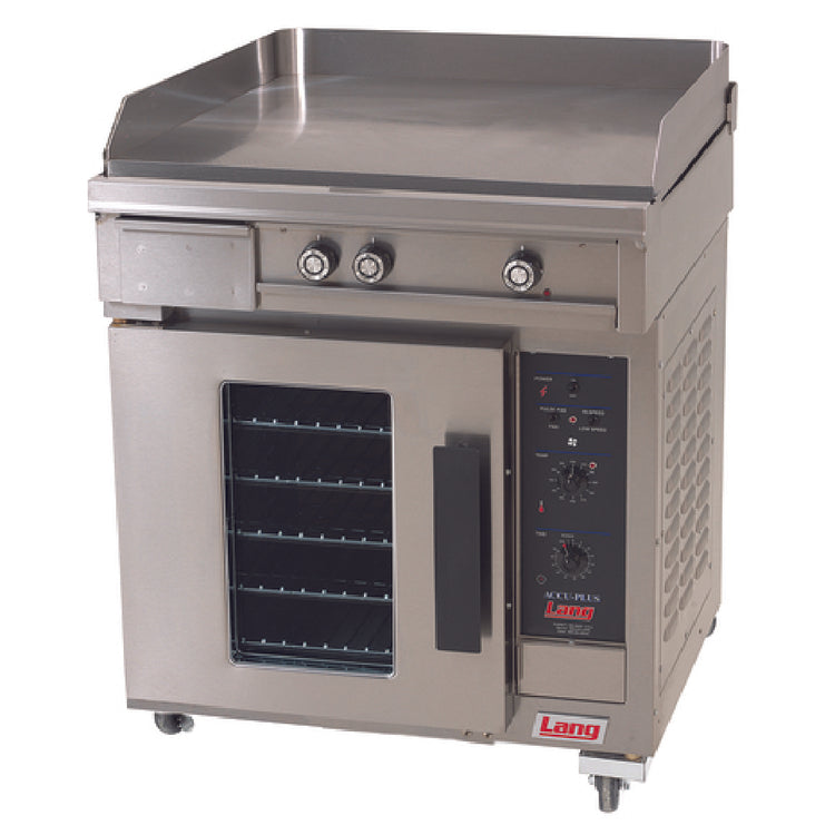 The Lang R30C-PTF Range Electric 30"W is a professional-grade kitchen appliance designed for versatile culinary applications. This electric range features a 30"W x 3/4" thick Snap Action Griddle, offering precise temperature control and even heat distribution for various cooking techniques. The convection oven base includes nine rack positions and comes with five racks, accommodating diverse cooking needs. Its programmable LCD controls allow for temperature settings ranging from 150-450°F, ensuring accuracy and consistency in food preparation. The oven is equipped with a 2-speed fan that includes pulse capability, enhancing airflow for optimal cooking results. Constructed with a 430 stainless steel exterior and interior, this range is both durable and easy to maintain. The unit is designed with a 2" vented stainless steel stub back and 4" casters for mobility, making it adaptable to different kitchen layouts. With a power output of 19.8kW, the Lang R30C-PTF is suitable for high-demand environments. Certified by cULus and NSF, it meets industry standards for safety and performance. This electric range is a valuable asset for commercial kitchens seeking reliability, efficiency, and precision in their cooking equipment.