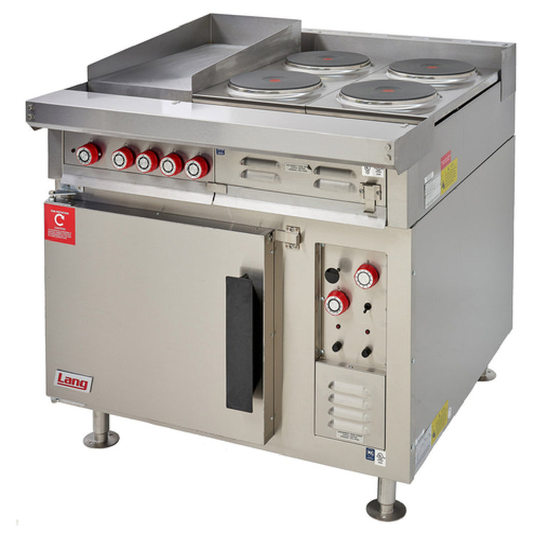The Lang R36C-ATFM Lang® Marine Heavy Duty Range Electric 36"W is a robust and versatile cooking appliance designed to meet the demanding needs of marine environments. This electric range features a 36-inch width, equipped with four 8-inch French plates and a 12-inch hot top, providing a diverse range of cooking surfaces. It includes snap action thermostatic controls for precise temperature management, enhancing cooking efficiency. The range's convection oven base offers six rack positions and comes with three racks, accommodating various cooking requirements. The oven thermostat ranges from 150-450°F and includes a 1-hour timer, allowing for precise baking and roasting. Constructed with a 430 stainless steel exterior, the range includes a 2-inch vented stainless steel stub back, ensuring durability and easy cleaning. The flanged bolt-down legs, grab bar, and sea rail add safety and stability, essential for marine applications. Additionally, the two-piece hatchable construction facilitates easy installation and access. Certified by UL Marine, NSF, and cULus, this range meets stringent safety standards, making it suitable for commercial marine kitchens. Its combination of advanced features and sturdy construction positions it as an ideal choice for chefs working in challenging maritime conditions.