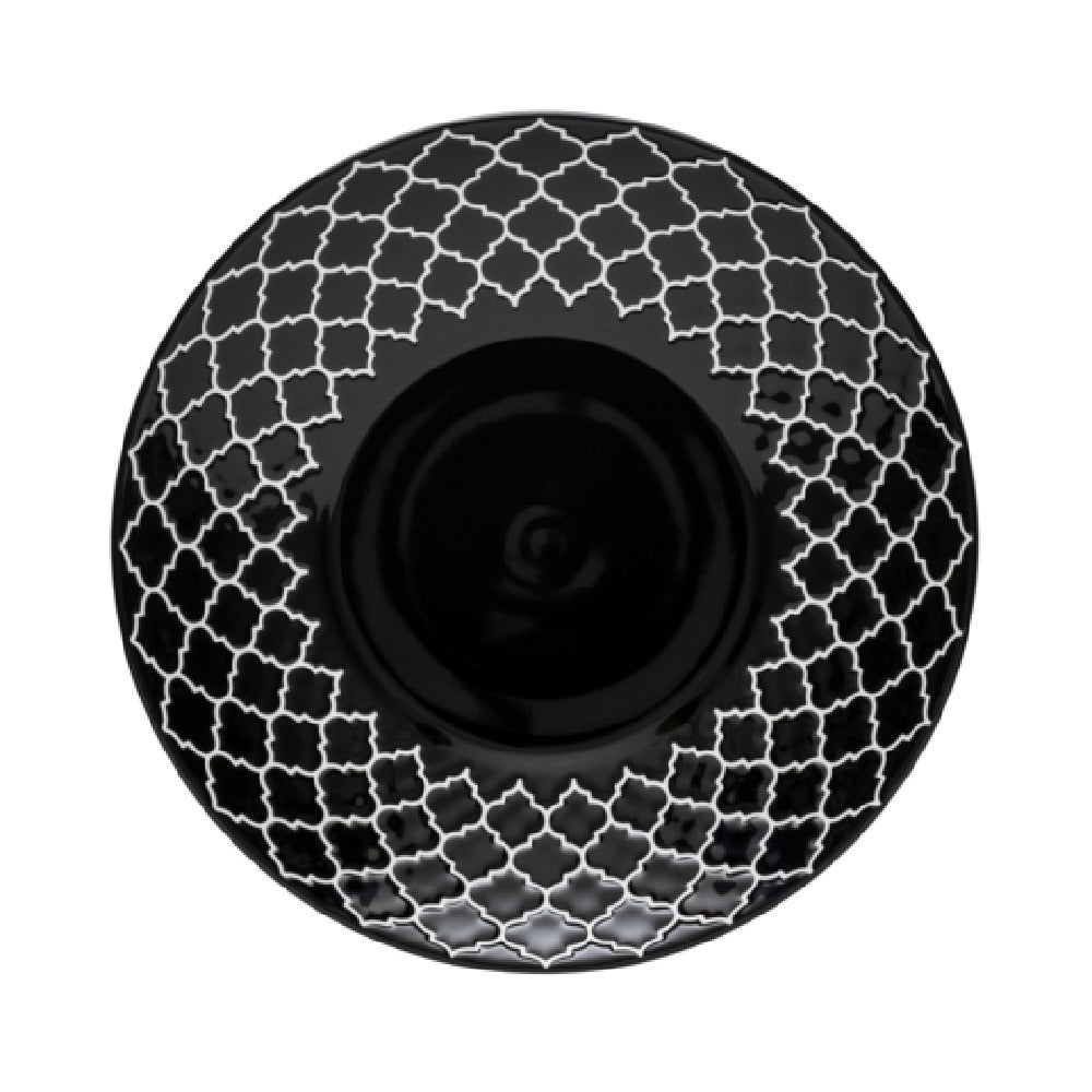 The Libbey 109979 Plate - 8-7/8" Dia. Deep Coupe With Well is a versatile and functional addition to any dining setup, catering to both casual and formal dining environments. With an 8-7/8 inch diameter, this plate is designed with a deep coupe style, providing ample space for various culinary presentations while simultaneously preventing spills and ensuring that sauces and dressings remain contained within the dish. This particular model features a distinctive black combo color, part of the Samira collection, offering a modern and sleek aesthetic that complements a wide range of tableware settings. Standing at a height of 1-1/2 inches, the plate's dimensions are optimized for stacking and storage efficiency, making it ideal for high-volume restaurants and caterers. Each case contains 12 of these well-crafted plates, packed by Cs, ensuring they are readily available for service in busy dining establishments. The Libbey 109979 is perfect for restaurateurs and food service professionals seeking a stylish yet practical solution for their tableware needs, delivering both form and function with its thoughtfully engineered design.