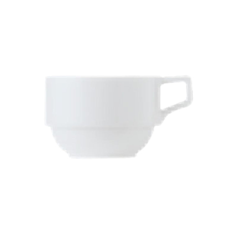The Libbey 1502-30220 (Formerly World Tableware) Cup 8-1/4 Oz. Stacking is a versatile porcelain cup designed to meet the varied demands of the hospitality industry. This cup showcases a bright white finish, making it an elegant choice for any dining setting. Part of the World® Collection, the Empire™ design offers timeless appeal. The cup measures 2-1/2 inches in height, 3-1/2 inches at the top diameter, 2 inches at the foot diameter, and 4-5/8 inches at the maximum diameter, providing a comfortable grip and ensuring a stable stackable feature. Designed to fit saucer 15002-10155, this product is perfect for space-saving storage solutions in bustling restaurants and cafes. Each case contains 36 cups, allowing for ample supply to meet the demands of high-volume service. The porcelain construction ensures durability and longevity, making it a reliable addition to any commercial kitchen. Packed by the case, the Libbey 1502-30220 cup is an ideal choice for establishments seeking to enhance their tableware collections with a product that seamlessly combines function, form, and style.