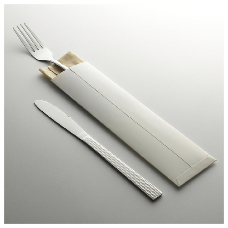 The Libbey 193-SETKF Flatware Kit is a comprehensive 3-piece set designed for both functionality and style, now branded under Libbey but formerly recognized as World Tableware. This kit includes a dinner fork (193 030), a knife (193 5302), and a napkin, all made from 18/0 stainless steel, ensuring durability and a lightweight feel. With 156 sets per case, it is a practical choice for large-scale dining establishments seeking to maintain high standards of service and presentation. The light weight of these utensils makes them easy to handle, catering to the needs of diverse dining environments from casual to fine dining. The inclusion of a napkin adds a touch of convenience, making this set a complete solution for table setting. The Libbey 193-SETKF Flatware Kit not only emphasizes quality and efficiency but also offers substantial value for hospitality businesses looking to enhance their tableware collection with a trusted brand that has transitioned from World Tableware to Libbey, renowned for producing reliable and stylish flatware. Packed by Cs, this set is tailored for the food service industry, providing a dependable and aesthetically pleasing flatware option for any dining setting.