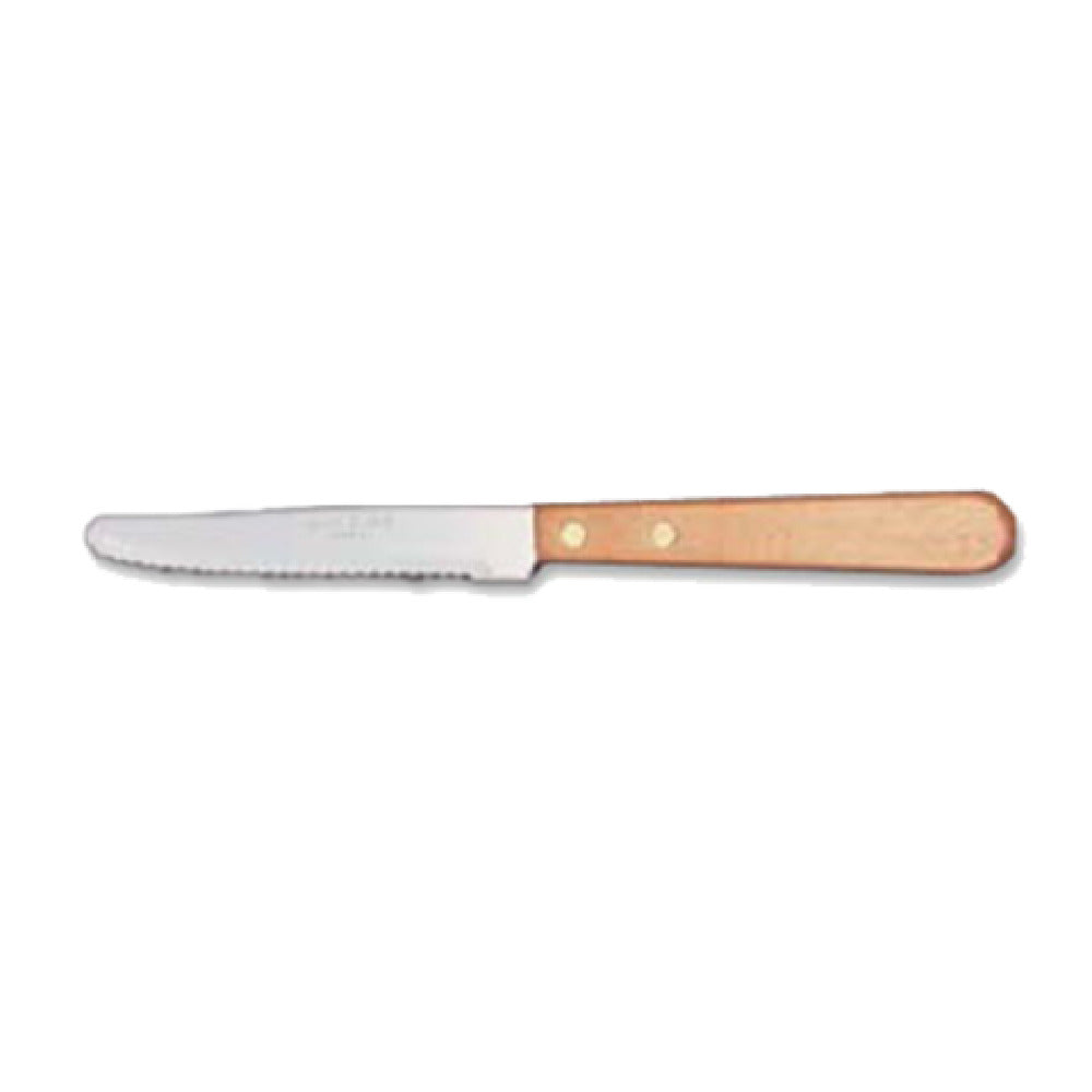 The Libbey 200 1702 (Formerly World Tableware) Steak Knife - 8-1/2" Round Tip is a premium cutlery tool designed for the hospitality and food service industries. With a length of 8-1/2 inches, this steak knife is crafted to deliver precise cutting capabilities for meats and other food items, making it an essential addition to any restaurant, steakhouse, or catering service. The knife features a distinctive round tip, enhancing safety without compromising on functionality, and is ideal for environments where both efficiency and guest safety are priorities. Each knife is equipped with a wooden handle, offering an ergonomic grip that ensures comfort during extended use, reducing hand fatigue for chefs and servers alike. Available in cases of 24, this knife is well-suited for high-volume establishments aiming for consistency in both presentation and performance. The transition from World Tableware to Libbey signifies a commitment to maintaining quality and trust in the brand. Tailored for different market segments, such as fine dining, casual eateries, and catering events, the Libbey 200 1702 steak knife stands out as a reliable tool, combining traditional aesthetics with durable functionality to meet the varied demands of professional culinary environments.