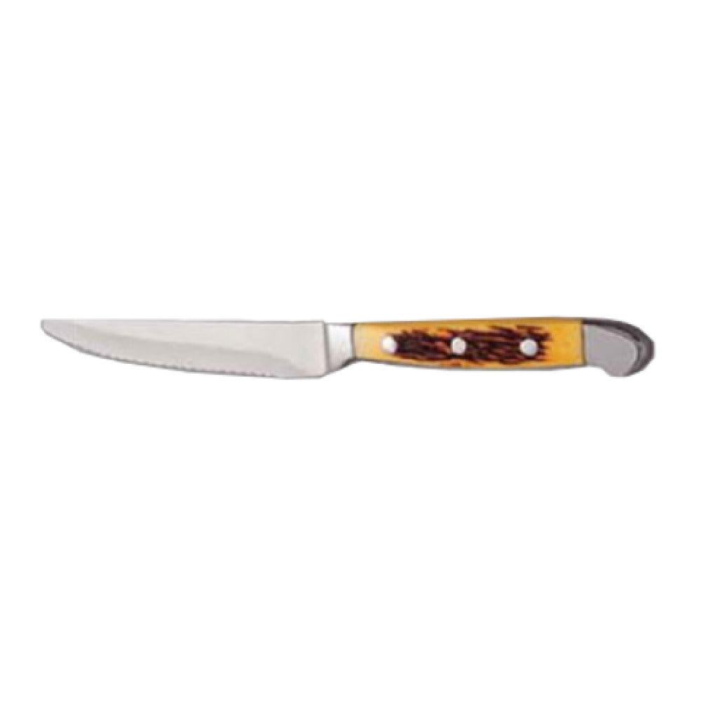 The Libbey 201 2522 - previously known as World Tableware - Steak Knife 9" Full Tang is meticulously designed for culinary excellence, appealing to both professional chefs and discerning home cooks. This steak knife features a full tang construction, ensuring superior balance and strength, which is crucial for precise cutting and longevity. Measuring an impressive nine inches, it provides an optimal length for cutting through thick cuts of meat with ease. The knife's standout feature is its vibrant yellow pom handle, which combines ergonomic comfort with aesthetic appeal, making it not only a functional tool but also a stylish addition to any dining setting. Sold in cases of 12, this steak knife is ideal for restaurants and catering services that demand both quantity and quality. The Libbey 201 2522 delivers a reliable and durable cutting edge, serving the needs of the foodservice industry where efficiency and performance are paramount. Its design caters to those who value premium quality and a touch of elegance, making it a versatile choice for various market segments within the culinary industry.