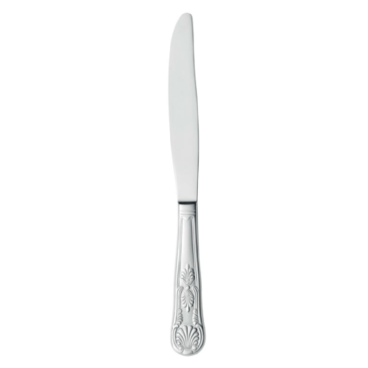 The Libbey 244 5502, previously recognized under the World Tableware brand, is a dinner knife that measures 9-1/2 inches in length, offering a distinct blend of elegance and functionality. Its fluted blade adds a touch of sophistication, ideal for upscale dining environments. The knife features a solid handle that ensures comfort and durability, crafted from 18/0 stainless steel, renowned for its corrosion resistance and affordability. This specific model belongs to the Kings collection within the esteemed World® Collection, known for its classic and regal designs. Packaged in cases of 36, it suits a wide range of market segments from high-end restaurants to catering services, providing both aesthetic appeal and practical utility. Its stainless steel composition makes it a reliable choice for establishments seeking quality cutlery that withstands the rigors of frequent use. The Libbey 244 5502 is an excellent addition to any cutlery lineup, offering a balance of tradition and performance tailored for the food service industry.