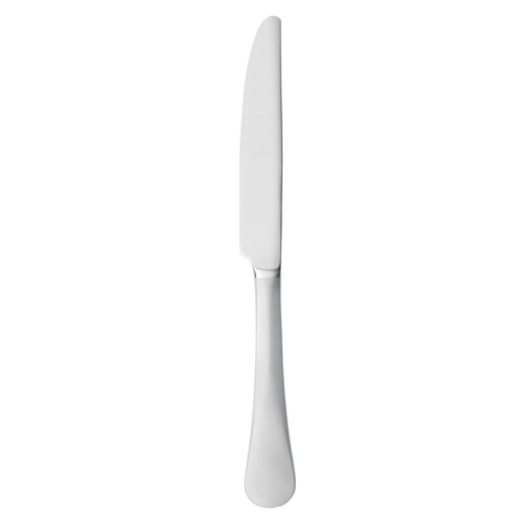 The Libbey 703 5501 Dinner Knife 9-3/8" with a serrated blade is a refined piece of flatware, distinguished by its solid and sand-blasted handle that ensures a comfortable grip and a sophisticated appearance. Crafted from 18/8 stainless steel, this knife combines durability with a sleek aesthetic, making it an ideal choice for both casual and formal dining settings. The serrated blade design provides efficient cutting, enhancing the dining experience by effortlessly slicing through various types of food. Part of the Reserve by Libbey collection, the Equity series embodies quality craftsmanship, promising long-lasting performance in any culinary establishment. Available in a case of 12, this dinner knife is perfect for restaurants seeking to maintain consistency in their table settings, as well as for event venues that require reliable and stylish utensils to complement their service. Its robust construction and elegant design make the Libbey 703 5501 Dinner Knife not only a practical tool but also a statement piece that adds a touch of sophistication to any dining arrangement.
