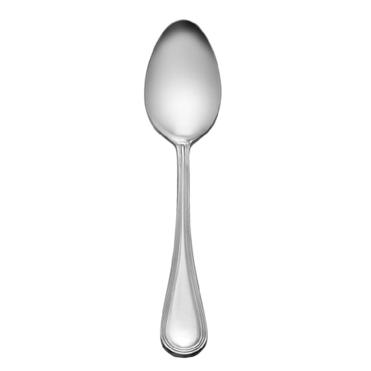 The Libbey 774 103 (Formerly World Tableware) European Tablespoon is a meticulously designed utensil, measuring 7-5/8 inches in length and crafted from high-quality 18/8 stainless steel. This product is part of the Geneva series within the International Collection, reflecting a blend of durability and elegance suitable for various dining settings. The tablespoon's construction from 18/8 stainless steel, which contains 18% chromium and 8% nickel, ensures excellent resistance to corrosion and enhances its shine and durability over time. It is available in a case of 12, making it an ideal choice for restaurants, catering services, and hospitality industries that require reliable and aesthetically pleasing flatware. The European design of the tablespoon caters to a variety of culinary applications, from formal dining to casual meals, and adds a sophisticated touch to table settings. Its well-balanced weight and length make it comfortable to hold and use, enhancing the dining experience for guests. The Libbey 774 103 tablespoon is a versatile and robust piece of cutlery, meeting the needs of professional chefs and restaurant operators who value both performance and style in their kitchen equipment.
