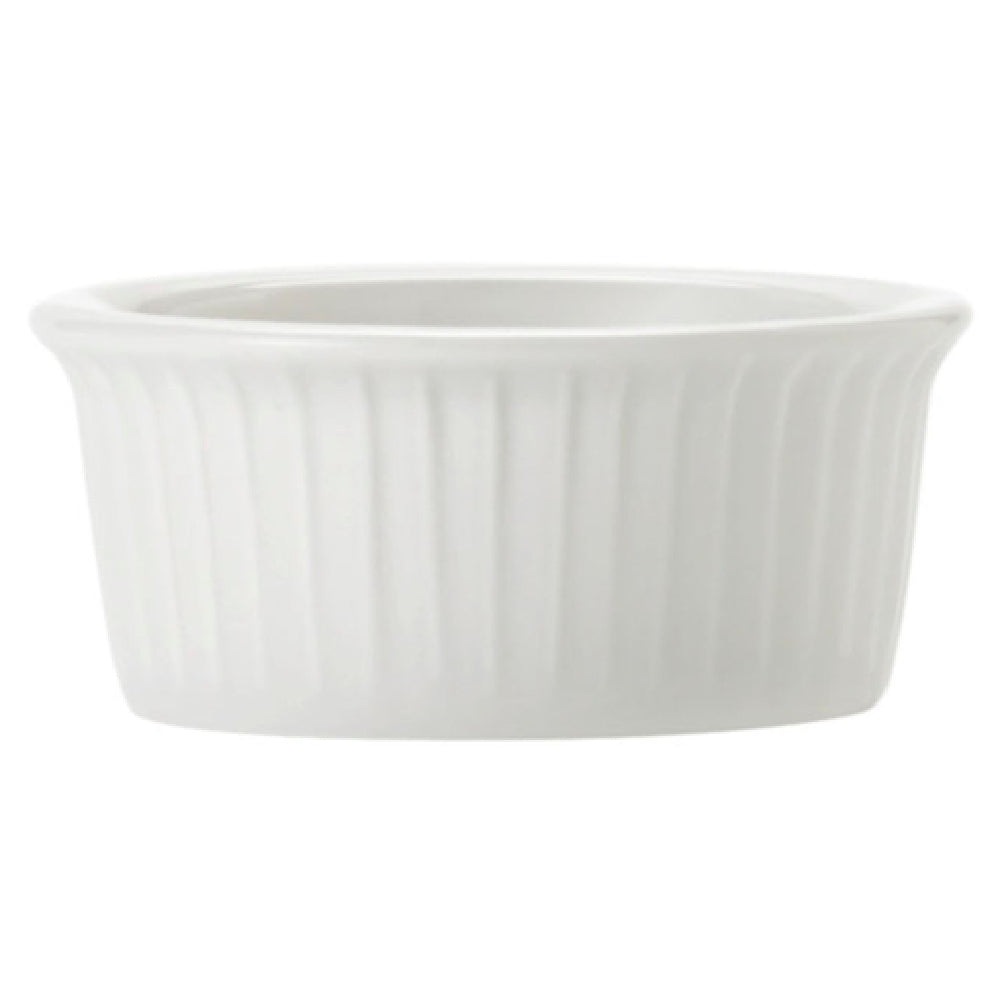 The Libbey 840-901-112 (formerly known as World Tableware) Ramekin is a versatile and elegantly designed piece, perfect for a range of dining settings. With a capacity of 1-1/2 ounces, this ramekin is designed to meet the needs of both casual and formal dining experiences. Its dimensions are precise: 2-1/2 inches in diameter and 1-1/8 inches in height, making it ideal for serving small portions of sauces, desserts, or condiments. The round shape and rolled edge of this ramekin enhance its aesthetic appeal while ensuring ease of use and handling. The fluted design adds a touch of sophistication, making it a great addition for upscale dining establishments. Made from bright white porcelain, specifically Porcelana™, the ramekin boasts durability and a classic look that complements any table setting. This product is available in cases of 48, making it a practical choice for larger venues such as restaurants, caterers, and banquet facilities. Its durability and timeless style also make it suitable for home use, where both quality and elegance are appreciated. The Libbey 840-901-112 ramekin seamlessly combines function and design, catering to various market segments within the food service and hospitality industries.