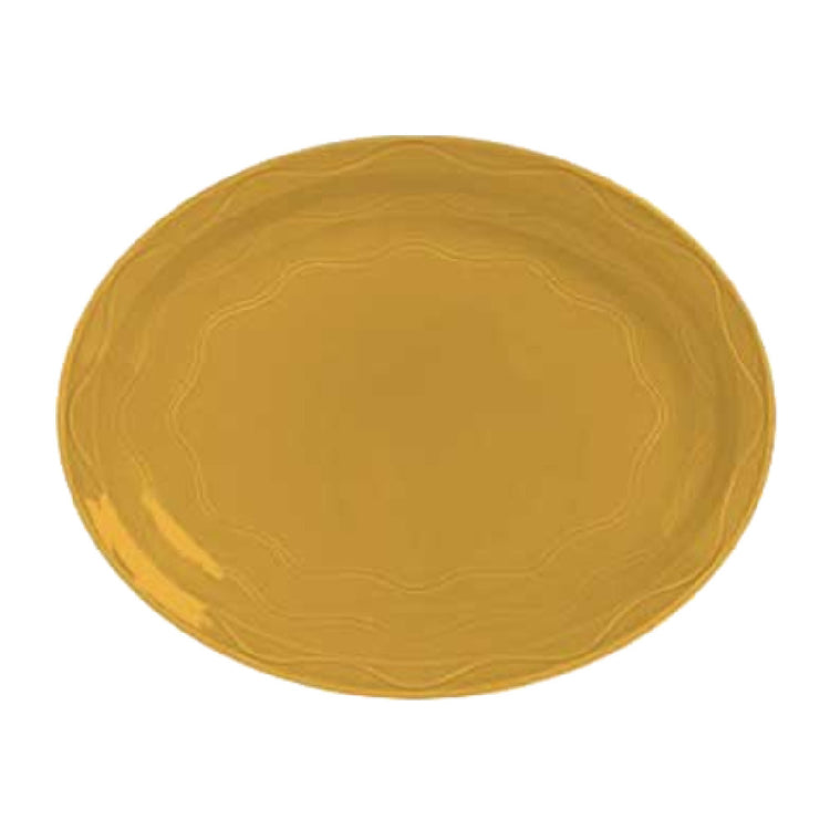 The Libbey 903033001, previously known as the Syracuse China Platter, is a distinguished serving piece measuring 13-5/8 inches by 10-1/2 inches in an oval shape. This platter is crafted from premium porcelain, ensuring durability and elegance, making it a suitable choice for both professional and home dining settings. The platter is fully vitrified, meaning it is non-porous and has undergone a thorough glazing process, rendering it resilient to stains and odors while providing a sleek, glossy finish. A glazed foot further enhances its stability and protection on various surfaces. The Cantina® carved pattern and shape add a touch of sophisticated design, enhancing visual appeal while maintaining a timeless aesthetic. Available in a striking saffron color, this platter brings a warm and inviting tone to any table setting. Each case contains six platters, allowing for adequate service settings in restaurants or catering events. This product is meticulously packed by case, ensuring safe transportation and delivery. The Libbey 903033001 platter is an ideal choice for those seeking a blend of durability, style, and functionality in their serving ware, tailored to meet the demands of diverse market segments within the hospitality industry.