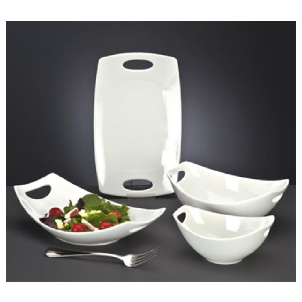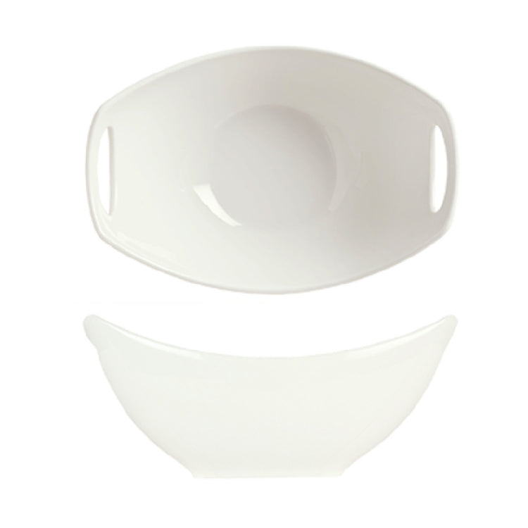 The Libbey 905356409, formerly known as the Syracuse China Bowl, is a versatile dining essential with a capacity of 13 oz. and a unique Slenda® Practica pattern and shape. Measuring 7" x 4-3/4" x 3"H, this oval bowl is designed with practicality in mind, featuring convenient handles that enhance functionality and ease of use. Its construction from fully vitrified porcelain ensures durability and longevity, making it a reliable choice for both home and professional use. The White Royal Rideau™ body color adds a touch of elegance, complementing a range of table settings. This product is available in cases of 12, making it suitable for larger dining establishments or those seeking to maintain consistency in their tableware. The Libbey 905356409 bowl is ideal for various segments within the food service industry, including restaurants, catering services, and hospitality venues, due to its combination of aesthetic appeal and practical design features. Its robust build and classic design make it a valuable addition to any culinary setting, accommodating both everyday usage and special occasions with equal grace.