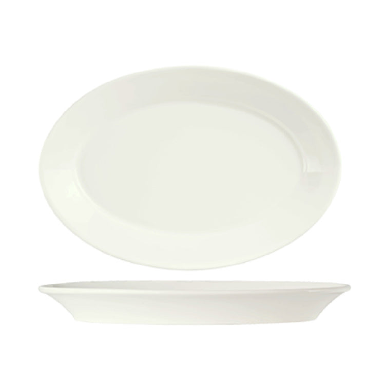 The Libbey 905356823, previously known as the Syracuse China Platter, features dimensions of 13-3/8 inches by 9-1/2 inches by 1-1/2 inches in height, presenting a versatile oval shape that suits a variety of dining settings. Its wide rim design is both functional and aesthetic, providing ample space for enhanced presentation, while its footed structure ensures stability and a touch of elegance. Constructed from fully vitrified porcelain, this platter is part of the Slenda pattern and shape, offering a sleek and contemporary look. The platter's White Royal Rideau body color complements any table setting, adding a sophisticated touch. Packaged with 12 platters per case, it’s a practical choice for establishments looking for bulk purchase options. Ideal for use in both casual and upscale dining venues, this platter is designed to meet the needs of restaurants, hotels, and catering services. Its durable build ensures longevity even in high-traffic environments, making it an excellent addition to any professional setting. The Libbey 905356823 platter is a dependable choice for those seeking quality and style, ideal for serving a variety of dishes with precision and flair.