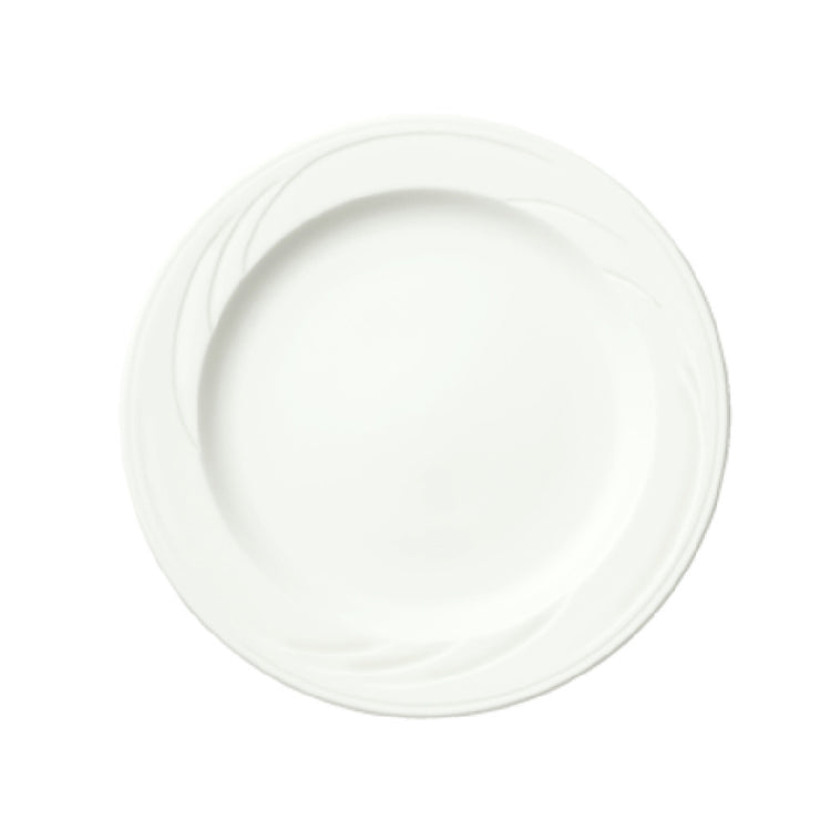 The Libbey 905437983, formerly known as the Syracuse China Plate, is an 8-inch round plate designed with a medium rim and a flat profile, making it a versatile choice for various dining settings. Crafted from fully vitrified porcelain, this plate ensures durability and resistance to chipping, ideal for both commercial and residential use. The plate features the elegant Élan pattern and shape, enhancing its aesthetic appeal. Its White Royal Rideau body color adds a touch of sophistication and versatility, allowing it to complement a wide range of table settings. Supplied in cases of 12, this plate provides a cost-effective solution for restaurants, catering businesses, and event planners looking for high-quality tableware. The Libbey 905437983 plate's combination of style, functionality, and durability makes it suitable for upscale dining environments, casual eateries, and special events, offering a reliable option for serving a variety of dishes. Its thoughtful design and robust construction cater to the needs of different market segments within the hospitality industry, ensuring that this plate meets the demands of professionals seeking both performance and elegance in their tableware solutions.