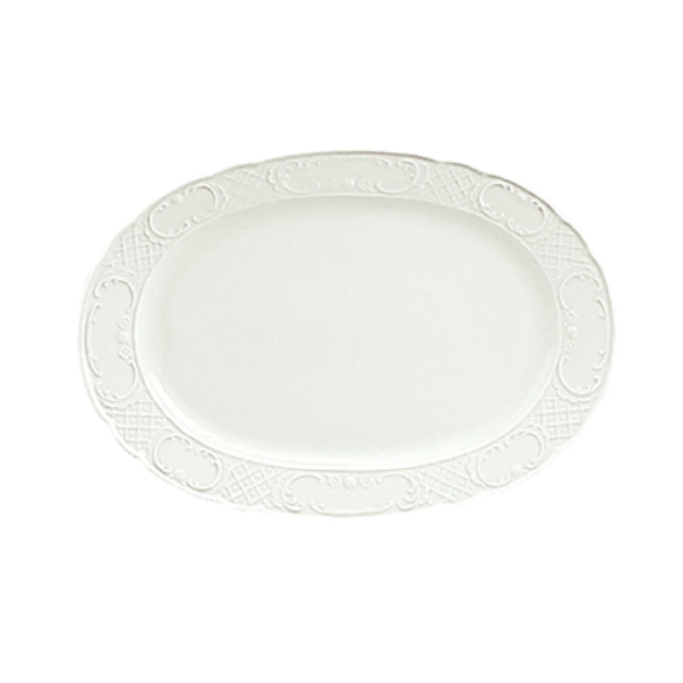 The Libbey 9062029 Platter, previously known as Syracuse China, measures 11-1/2 inches by 8-1/4 inches and features an elegant oval shape. Crafted from high-quality porcelain, it is part of the Marquis pattern, a testament to its sophisticated design under the Schonwald brand. The platter boasts the Continental White finish, offering a timeless and versatile aesthetic suitable for various dining settings. This product is sold in sets of six per case, providing an ideal solution for both small and large-scale food service operations. Its dimensions and durable porcelain construction make it a practical choice for restaurants, hotels, and catering businesses seeking reliable and stylish serveware. The Libbey 9062029 Platter combines functional design with elegance, meeting the diverse needs of different market segments within the culinary industry. Its classic design ensures it complements a wide range of table settings, while its robust construction ensures longevity and resilience in busy dining environments. Whether used for presenting appetizers, entrees, or desserts, this platter enhances the dining experience with its refined appearance and practical size.