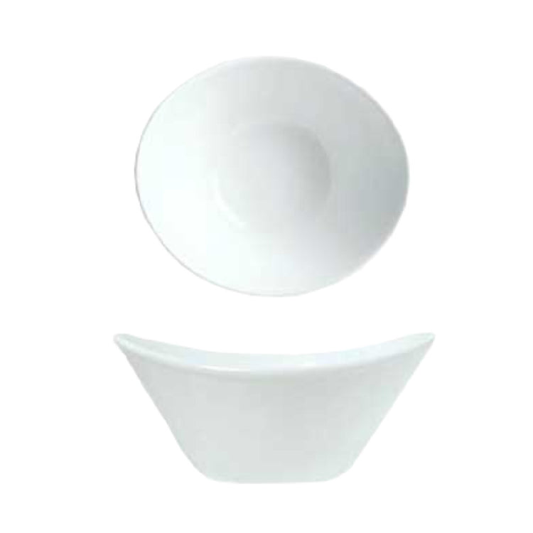 Libbey 911194601 (Formerly Syracuse China) Infinity Bowl 7 Oz. 5-1/8" x 4-1/2" x 2-3/8"H is a versatile and elegantly designed porcelain bowl, ideal for both restaurant and home use. Featuring a 7-ounce capacity, it is perfectly suited for serving a variety of dishes, from appetizers to desserts, making it a valuable addition to any table setting. The bowl's dimensions, 5-1/8" x 4-1/2" x 2-3/8"H with a 2" diameter foot, provide a stable base while maintaining a sleek, oval silhouette. The polished foot ensures a smooth finish and enhances the bowl's durability. Made from fully vitrified porcelain, this bowl is part of the Chef's Selection™ pattern and shape, showcasing the Aluma White™ body color which complements a wide range of dining environments. With 36 pieces per case, this product is ideal for large-scale culinary operations, offering both practicality and aesthetic appeal. Libbey's commitment to quality is evident in the craftsmanship and design of the Infinity Bowl, making it a preferred choice for those seeking both functionality and elegance in their serving ware.