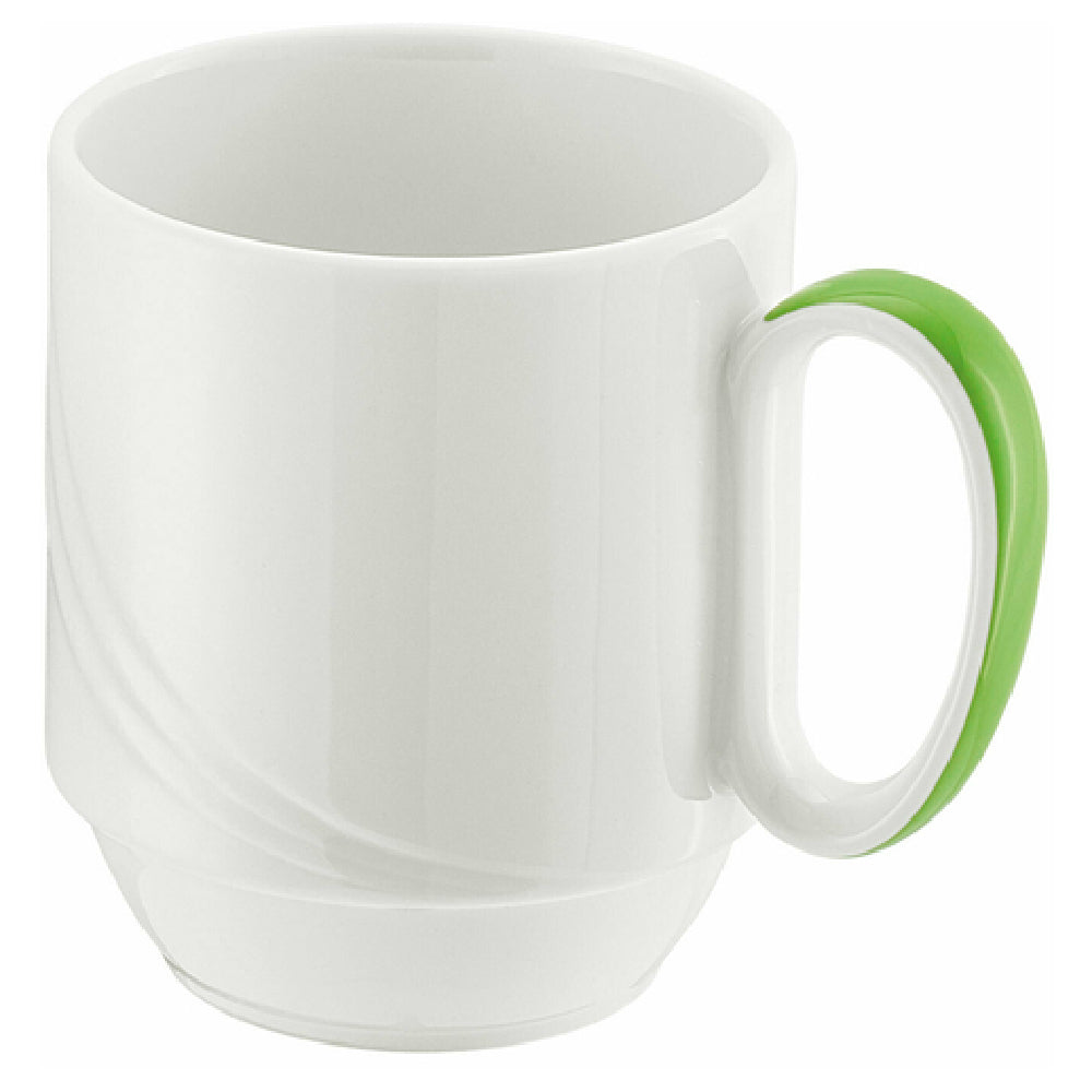Libbey 9185629-62941, formerly known as Syracuse China, is a porcelain mug that boasts a capacity of 9-1/2 ounces. This mug, part of the Donna Senior pattern collection by Schonwald, is designed in a classic Continental White with an elegant light green band, adding a touch of sophistication to any table setting. Its dimensions are meticulously crafted, with a height of 3-3/8 inches, a top diameter of 3-1/8 inches, and a base diameter of 2-1/8 inches, making it both aesthetically pleasing and practical. The stackable feature of this mug enhances its usability, allowing for efficient storage in busy environments such as restaurants, cafes, and catering services. Packaged in sets of six per case, it provides a manageable solution for establishments that require quality and consistent tableware. This product delivers enduring quality and timeless design, making it suitable for a wide range of market segments within the hospitality industry, from casual dining to formal service. It is an ideal choice for those seeking durability and style, embodying both function and form to meet the diverse needs of professional food service operations.