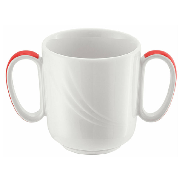 The Libbey 9185631-62931 Mug, previously known as Syracuse China, is a versatile porcelain mug with a capacity of 10-1/2 oz. Ideal for various dining environments, its dimensions are meticulously crafted with a height of 3-3/8 inches, a top diameter of 3-1/4 inches, and a base diameter of 2-1/8 inches. This mug features a unique 2-handle design, providing a secure and comfortable grip for users. Its stackable nature ensures efficient space management, making it a practical choice for establishments with limited storage. The mug is adorned with the Donna Senior pattern, showcasing a Continental White finish complemented by a striking red band, offering a touch of elegance and sophistication. Manufactured by Schonwald, each case contains six mugs, ensuring ample supply for your dining needs. This product is suitable for cafes, restaurants, and hospitality settings, providing durability and style. The Libbey 9185631-62931 Mug is an excellent choice for businesses seeking a balance of aesthetic appeal and practicality, enhancing the dining experience with its refined design and functional features.