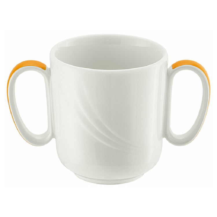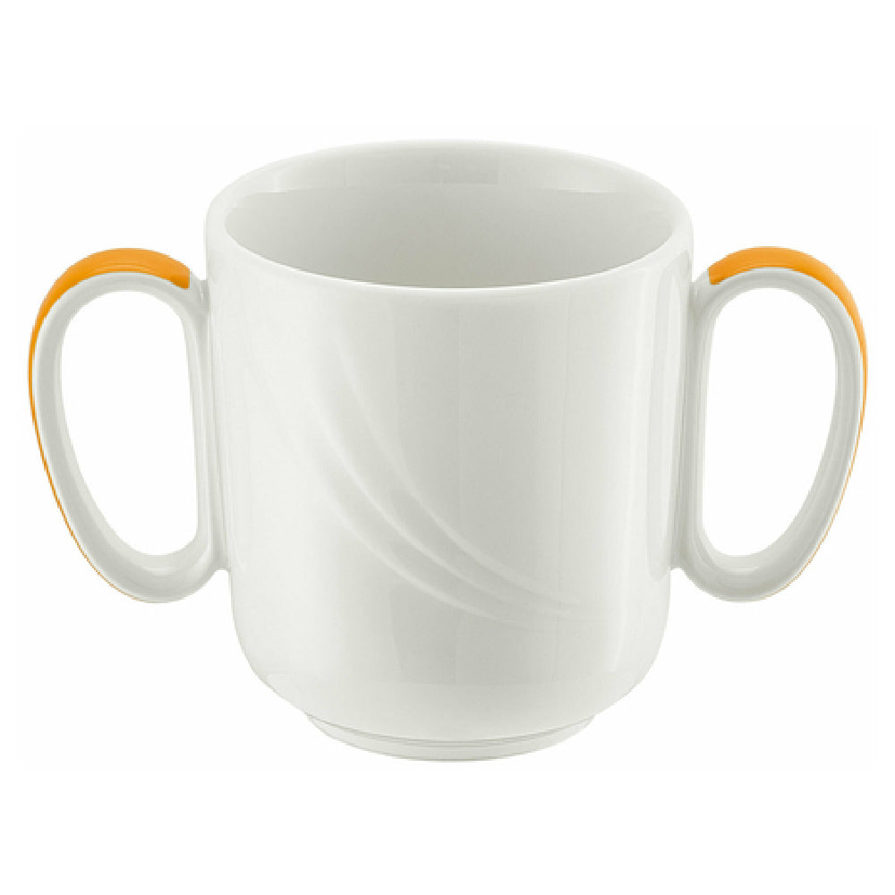 The Libbey 9185631-62991 Mug, formerly known as Syracuse China, is a versatile 10-1/2 oz. porcelain mug that stands out with its dual-handle design for added stability and ease of use. Measuring at a height of 3-3/8 inches, with a top diameter of 3-1/4 inches and a foot diameter of 2-1/8 inches, this stackable mug offers a compact and space-efficient solution for both high-volume hospitality settings and intimate dining experiences. The mug is part of the Donna Senior pattern, adding a touch of elegance with its Continental White finish complemented by an orange band. Crafted by Schonwald, this set of six mugs per case is ideal for restaurants, hotels, and catering services looking to enhance their tableware collection with a touch of sophistication. The Libbey 9185631-62991 Mug effortlessly combines aesthetic appeal with practical functionality, making it a valuable addition to any establishment's dining amenities. Its robust construction ensures durability and reliability, catering to the diverse needs of the foodservice industry while maintaining a refined presentation. This mug is perfect for various applications, from serving hot beverages in cafes to complementing breakfast services in hotels, offering a timeless design that adapts to multiple settings.