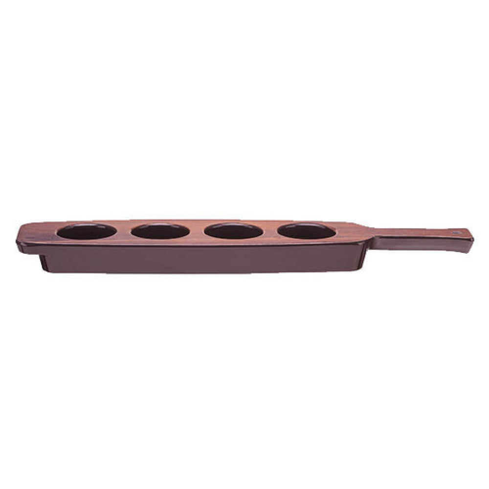 The Libbey 96459 Flight is a precisely crafted product measuring 18-3/4"L x 4-1/8"W x 1-3/8"H, featuring a four-well design that makes it an excellent choice for various culinary presentations. Constructed to be dishwasher safe, this piece ensures easy maintenance and cleaning, making it highly practical for busy commercial environments. The melamine construction provides enhanced durability and a lightweight feel while mimicking the sophisticated aesthetic of cherry wood, offering an elegant presentation without the maintenance issues associated with real wood. Each case contains six units, making it suitable for high-volume establishments that require consistency and quality in their serveware. The Libbey 96459 Flight is ideal for restaurants, bars, and catering services looking to elevate their presentation of drinks or small servings such as appetizers or tasters. Its unique design allows for creative presentations, ensuring that it caters to various segments within the food service industry, from casual dining to upscale events. This product's thoughtful design and practical features make it a valuable addition to any professional kitchen or dining setup, combining aesthetic appeal with functional excellence.