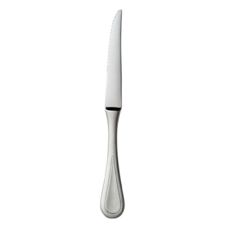 The Libbey 971 5762 Steak Knife, previously known under the World Tableware brand, is distinguished by its 9-1/2 inch fluted blade, specifically designed for precision cutting. Crafted from 18/8 stainless steel, this knife promises durability and corrosion resistance, making it an ideal choice for both professional culinary settings and fine dining establishments. Its solid handle ensures a comfortable grip, enhancing the user's control and efficiency during use. Part of the prestigious Aspen World® Collection, this steak knife not only meets but exceeds industry standards for quality and performance. Packaged with 36 knives per case, this product is particularly suited for high-volume restaurants and hospitality venues seeking to maintain a consistent and superior dining experience for their patrons. The Libbey 971 5762 Steak Knife stands out as a reliable tool in any kitchen, where precision, durability, and quality are paramount for both chefs and diners alike.
