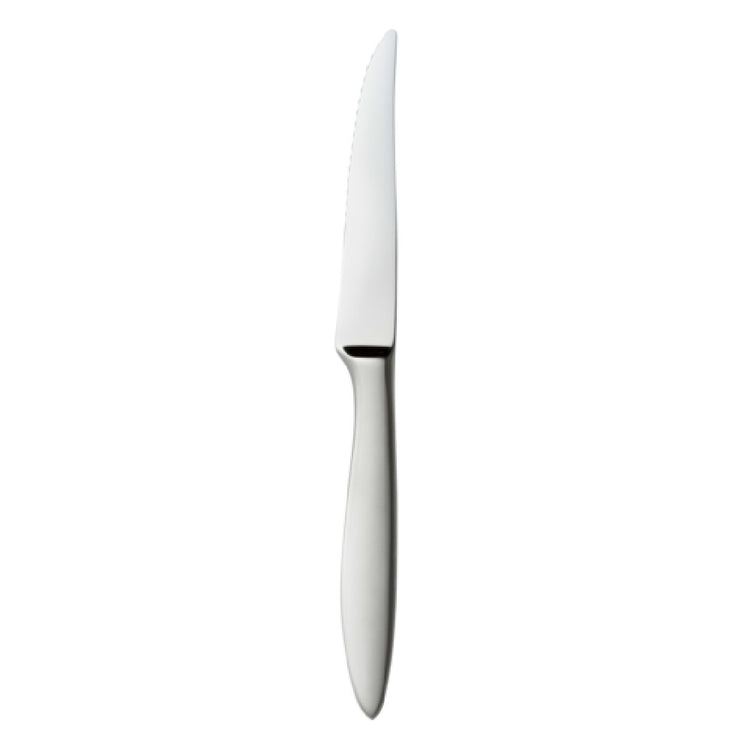 The Libbey 982 5762 (Formerly World Tableware) Steak Knife, measuring 9-1/8 inches, features a fluted blade that highlights its precision cutting capabilities, making it an essential tool for any dining establishment. Crafted from 18/8 stainless steel, this steak knife is part of the esteemed Contempra® and World® Collection, known for their durability and resistance to corrosion. The knife's solid handle provides a comfortable and secure grip, enhancing the dining experience for patrons. This product is available in a case of 36, catering to the needs of restaurants, hotels, and catering services that require reliable and high-quality cutlery. The sleek design and robust construction make it suitable for upscale dining environments, as well as more casual settings looking to elevate their tableware presentation. The Libbey 982 5762 steak knife seamlessly combines style with functionality, ensuring it meets the demands of various market segments within the hospitality industry. Whether it is used in a high-end steakhouse or a bustling banquet hall, this steak knife is designed to deliver exceptional performance and enhance the overall dining experience.