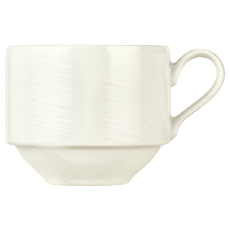 The Libbey 987659436, formerly known as Syracuse China Cup, is meticulously designed for versatility and practicality within various industry sectors. With a capacity of 8-1/2 ounces, this cup is ideal for serving a variety of beverages, from coffee and tea to specialty drinks, catering to sectors ranging from hospitality and catering to personal home use. The dimensions of 4-3/8 inches in diameter and 2-7/8 inches in height, combined with a handle, make it ergonomically friendly, enhancing the user experience by providing an easy grip and stability. The stackable design is a significant feature, allowing for efficient storage and organization, particularly beneficial in commercial settings with space constraints. Crafted from fully vitrified porcelain, this cup is not only durable but also resistant to stains and odor absorption, ensuring longevity and maintaining its pristine appearance through repetitive use. The "Reserve By Libbey" Silk pattern adds an element of elegance, suitable for upscale dining environments. Designed to fit saucer 987659332, it is perfect for those looking to create a cohesive table setting. Available in cases of 36, this product is an excellent choice for bulk purchasing, supporting businesses in maintaining consistency and quality in their service offerings.