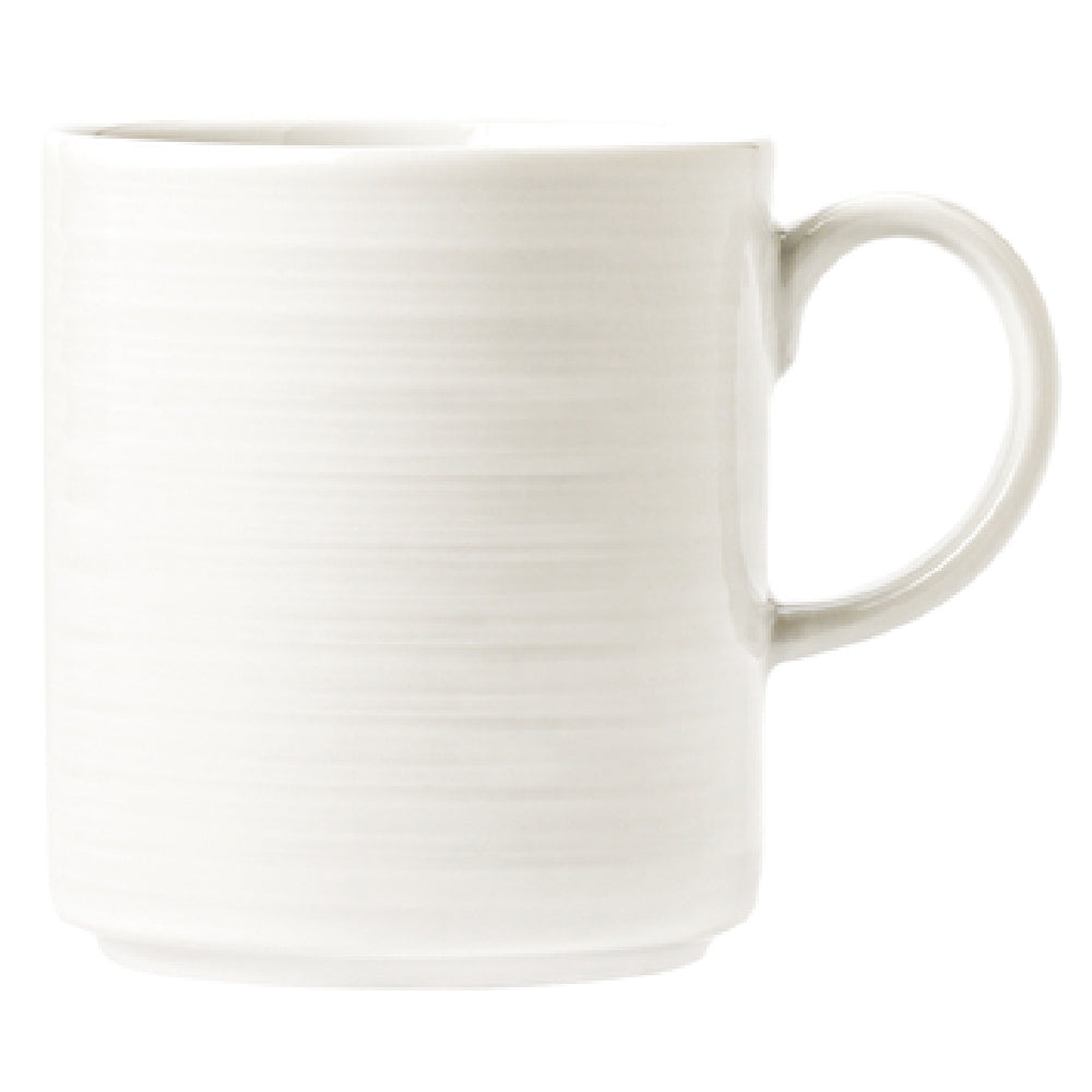 The Libbey 999001572 Mug, previously known as Syracuse China, is a versatile 12 oz. porcelain mug engineered for both durability and aesthetic appeal. Measuring 3-3/8 inches in top diameter and 3-3/4 inches in height, it is crafted with a user-friendly handle for comfortable handling. This mug features a stackable design, making it ideal for efficient storage in professional settings such as restaurants, cafes, and catering services. Its embossed surface and highly polished foot contribute to its elegant appearance and stable base. The mug is constructed from high-quality porcelain, incorporating a Microban® fully vitrified glaze, ensuring long-lasting use and resistance to stains and scratches. The Galileo⢠pattern and Constellation⢠shape, along with the Lunar White⢠body color, provide a sophisticated and modern look, enhancing its appeal to diverse market segments, including hospitality and food service industries. Available in cases of 36, the Libbey 999001572 Mug is designed to meet the demands of high-volume environments while maintaining its pristine condition, offering both practicality and style for any establishment seeking to elevate its beverage service presentation.