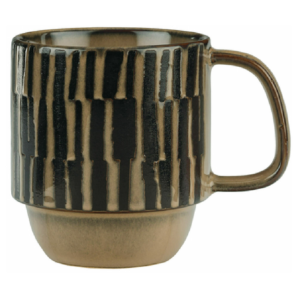The Libbey AFAR-8C (Formerly World Tableware) Mug 12 Oz. Stackable is a versatile stoneware mug designed for both efficiency and aesthetic appeal. With its 12 oz. capacity, this mug is perfect for serving a variety of hot beverages, making it a valuable addition to any café, restaurant, or home kitchen. Its stackable feature is a practical solution for space-saving storage, especially beneficial in environments with limited space. The mug features an elegant tribal design, set against a cream-colored backdrop, adding a touch of style to any table setting. Measuring H 3-7/8", W 4-7/8", and L 3-3/8", it combines a compact form with a generous volume. The mug is built for convenience, as it is both dishwasher and microwave safe, ensuring easy cleaning and versatile utility. Each case includes 12 mugs, providing ample supply for larger establishments. The Libbey AFAR-8C is crafted to deliver durability and style, making it an ideal choice for hospitality sectors and home use. Its robust stoneware construction ensures it withstands frequent use while maintaining its visual appeal, catering to the diverse needs of different market segments within the beverage service industry.