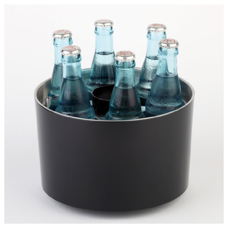 The Libbey APS 00621 Bottle Cooler is a meticulously crafted product designed for both functionality and style. Measuring 9-1/8 inches in diameter and 6 inches in height, this round, stackable bottle cooler is ideal for a variety of settings, from conference rooms to casual gatherings. It accommodates up to six bottles, ensuring that your beverages are kept cool and accessible. The cooler includes practical features such as a bottle opener and a small cap bowl, which enhance its usability and convenience. Made by APS® Germany, it combines European design with practicality. The cooler is dishwasher safe, allowing for easy cleaning and maintenance, which is particularly beneficial for high-usage environments like hospitality and event spaces. Its sleek black finish adds a touch of elegance, making it a sophisticated addition to any setting. Whether used in a corporate conference or a casual home setting, the Libbey APS 00621 Bottle Cooler offers a unique blend of versatility and elegance, making it a valuable asset for anyone looking to efficiently manage and present their beverages. Packed by case, this product ensures that each cooler is well-protected and ready for immediate use upon arrival.