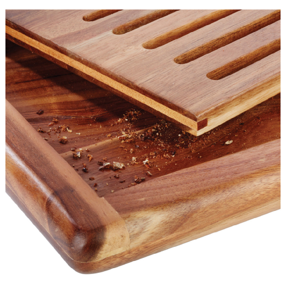 The Libbey APS 00884 Bread Station Cutting Board is a GN 1-1 unit measuring 20-7/8"L x 12-7/8"W x 1"H, crafted to meet the rigorous demands of professional kitchens and bakeries. This rectangular cutting board is not only stackable but also features a slotted bread crumb shelf, which is essential for maintaining a clean and efficient workspace. Designed with non-slip feet, it guarantees stability during use, ensuring safety and precision in every cut. Made from acacia wood, known for its durability and aesthetic appeal, the board comes in a charming caramel finish that complements any kitchen décor. The product is associated with Akazia and carries the APS® Germany mark, emphasizing its high-quality European craftsmanship. Packaged six per case, it offers convenience for bulk purchases. With its blend of functionality and style, the Libbey APS 00884 is an invaluable tool for culinary professionals seeking reliable and attractive kitchen solutions.