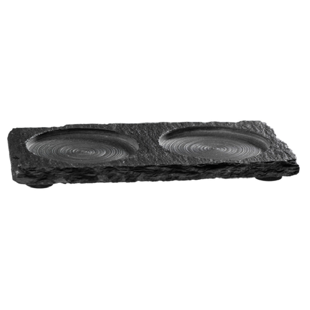 The Libbey APS 00971 Compartment Tray is a meticulously crafted piece, designed to enhance dining and serving experiences with its functional and aesthetic attributes. Measuring 6 inches long, 3-1/4 inches wide, and 3/8 inches high, this rectangular tray features two distinct 2-3/8 inch diameter wells, making it ideal for a variety of segments such as hospitality, catering, or home dining. Its stackable nature allows for efficient storage and space saving, addressing the needs of dynamic environments where organization is key. The tray is equipped with non-slip feet, ensuring stability and reducing the risk of spills, thus enhancing safety in fast-paced settings. Crafted in a natural slate color, it offers an elegant and modern touch, seamlessly blending with diverse table settings. As part of the Mills APS® collection from Germany, it assures quality and durability, providing peace of mind to users who require reliable tableware. With 36 trays packed per case, it offers an optimal solution for bulk purchase needs, appealing to both commercial venues and large events. This combination of practical design and aesthetic appeal makes the Libbey APS 00971 Compartment Tray a versatile addition to any setting.