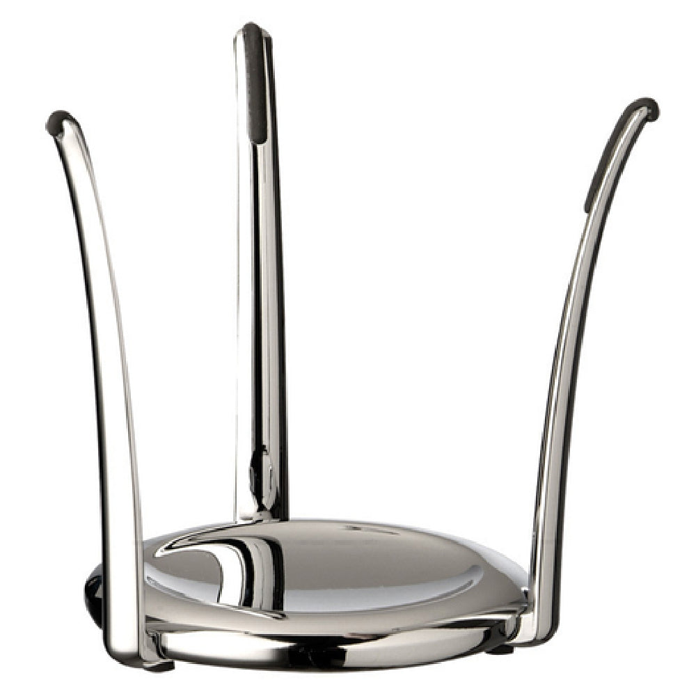 The Libbey APS 03622 Buffet Display Stand 6" Dia. X 5-5/8"H Round is a meticulously engineered kitchen accessory designed to enhance the presentation of culinary creations in various food service environments. With a diameter of 6 inches and a height of 5-5/8 inches, this round display stand is crafted from chrome-plated steel, ensuring both durability and a sleek aesthetic. Featuring a 3-prong stackable design, it allows for efficient use of space and easy storage, making it a practical choice for bustling buffet settings. The base uniquely doubles as a spoon holder, adding functionality to its design. Its non-slip feature provides stability, ensuring that your displayed items remain securely in place. The cast-zinc arms contribute to its robust structural integrity, enhancing its resilience in high-use situations. This product is associated with the King line from APS® Germany, signifying a commitment to quality and precision. The Libbey APS 03622 is packed by Cs, ensuring it arrives ready for immediate integration into your service display. This buffet display stand is an ideal solution for caterers, restaurant owners, and event planners seeking a reliable and visually appealing way to elevate their food presentations.