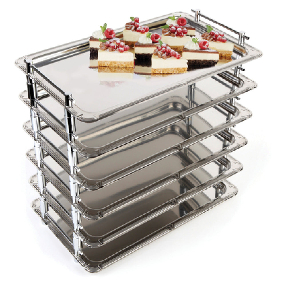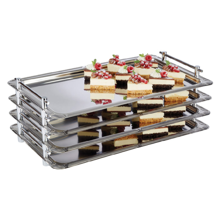 The Libbey APS 11300 Serving Tray GN 1/1 is a meticulously crafted rectangular tray measuring 20-7/8 inches in length, 12-7/8 inches in width, and 2-1/4 inches in height. This tray is constructed from 18/10 stainless steel, providing both durability and a mirror-polished finish that enhances its aesthetic appeal. The tray's stackable nature and integrated handles make it a practical choice for efficient storage and easy transportation, particularly in busy food service environments. A decorative edge adds a touch of elegance, making it suitable for both casual and formal settings. The Libbey APS 11300 is dishwasher safe, ensuring easy maintenance and high hygiene standards, critical for professional kitchens and catering services. Proudly made in Germany, it is part of the Profi Line by APS® Germany, known for its superior quality and craftsmanship. This serving tray is packaged individually per case, catering to the needs of various market segments, including restaurants, hotels, and catering businesses that demand both functionality and style in their serviceware.