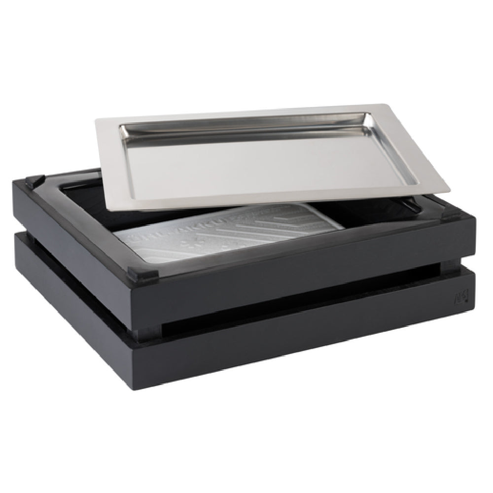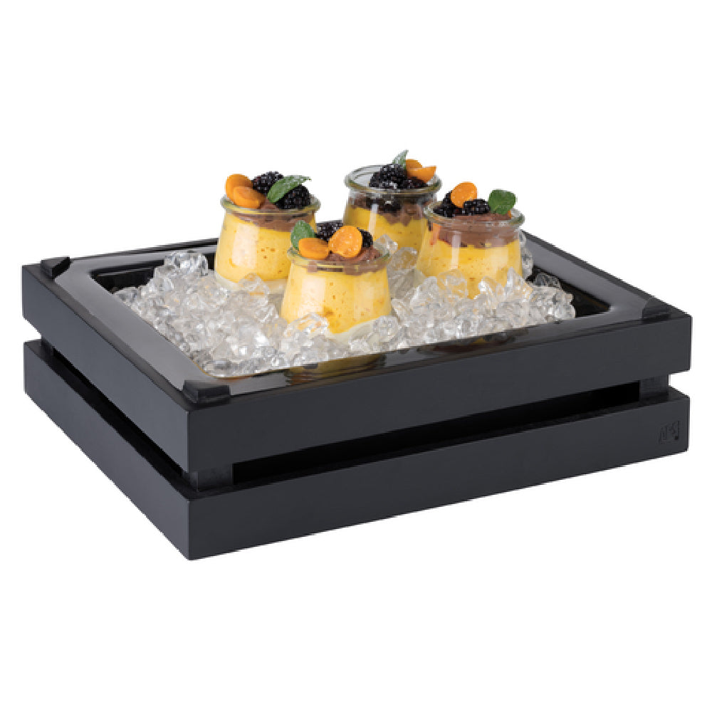 The Libbey APS 11617 Insert Box GN 1/2 is a meticulously designed rectangular container, measuring 12-7/8 inches in length, 10-1/2 inches in width, and 3-3/8 inches in height. Crafted from durable polystyrene, its black finish lends a sleek and professional appearance suitable for various industry applications. A notable feature includes its locking corner notches, enhancing its stability and functionality when used in conjunction with corresponding products, specifically the APS 11621 and APS 11627 models. This Insert Box is part of the Superbox collection from APS Germany, known for precision and quality. Its design is optimized for ease of maintenance, being dishwasher safe, thereby supporting high-efficiency operations in environments where time and hygiene are paramount considerations. The product is thoughtfully packaged, with one unit per case, ensuring it arrives in pristine condition. The Libbey APS 11617 Insert Box is an ideal solution for food service professionals seeking reliable and versatile storage options, accommodating a range of needs from food preparation to presentation. This innovative product exemplifies the synergy of form and function, meeting the standards and expectations of diverse market segments within the culinary and hospitality industries.