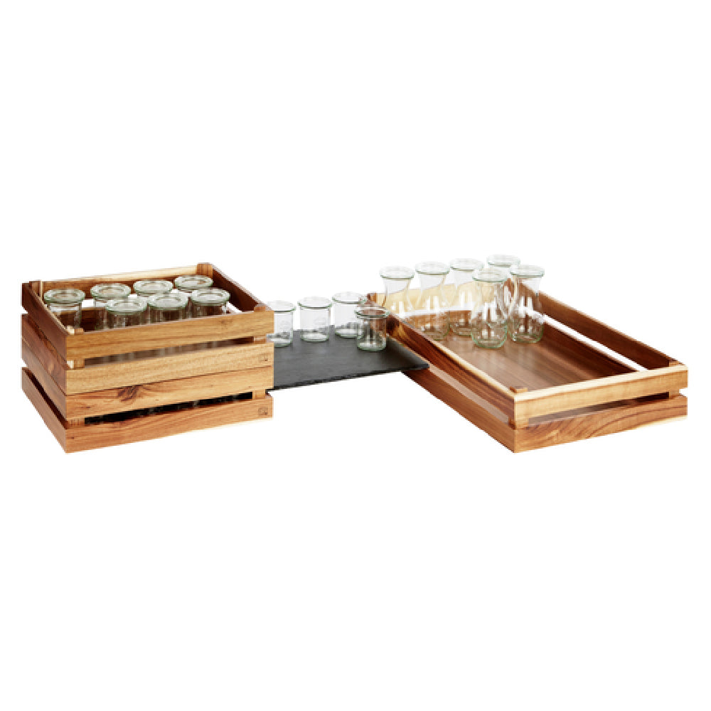 The Libbey APS 11621 Superbox Foundation is a versatile rectangular unit measuring 13-7/8 inches in length, 11-1/2 inches in width, and 4-1/4 inches in height. It is designed to accommodate a GN 1/2 pan, exemplifying its adaptability across various professional kitchen environments. This stackable unit is crafted from acacia wood, featuring a rich caramel finish that adds a touch of elegance to its practical design. Its non-slip properties ensure stability during use, making it a reliable choice for diverse culinary settings. The Superbox Foundation can function as a basket, riser, or base for a beverage ice bin, showcasing its multifunctionality within the food service industry. Manufactured by APS® Germany, this product is supplied as a single unit per case, ensuring convenience for businesses seeking to integrate it into their operations. Its robust construction and thoughtful design make it suitable for a wide array of applications, from upscale dining establishments to casual service environments, providing an efficient and stylish solution for display and service needs.