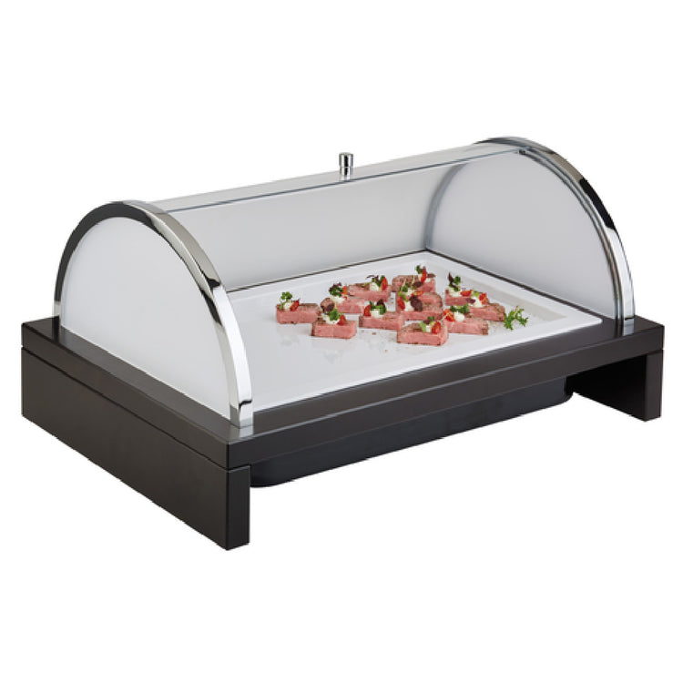 The Libbey APS 14990 Buffet Display is a versatile and elegant 4-piece set, specifically designed to enhance presentation in a variety of settings. With dimensions of 25-1/8"L x 16-3/4"W x 12-1/4"H, this rectangular buffet display is a perfect choice for professional catering, hospitality venues, and upscale dining environments. The set includes a melamine GN 1/1 tray, ensuring durability and ease of cleaning, making it suitable for high-traffic areas. Accompanying this is a refrigerator pack that maintains the freshness of your offerings, ideal for buffets requiring food to stay cool over extended periods. The roll-top acrylic transparent cover not only offers easy access but also protects the displayed items, adding a touch of sophistication while keeping hygiene in mind. The display's black maple wood base, accentuated with cast zinc trim, exudes an aesthetic appeal that complements any decor. Manufactured by APSĀ® in Germany, this buffet display reflects a commitment to quality and design excellence. Each component of the Libbey APS 14990 Buffet Display is thoughtfully crafted to meet the diverse needs of the food service industry, serving as a functional yet stylish solution for showcasing culinary creations.