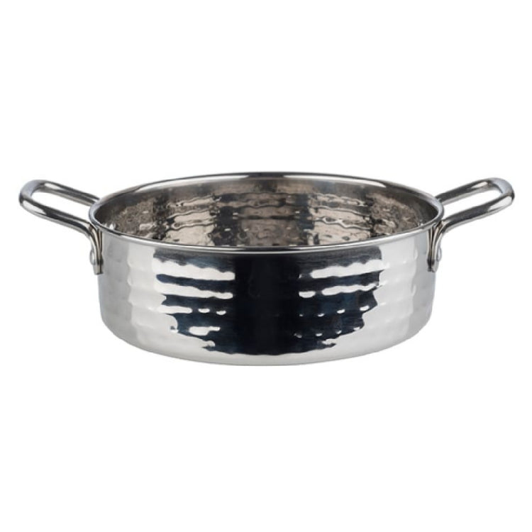 The Libbey APS 40188 Serving Pot is a versatile kitchen essential with a capacity of 25.3 oz, designed to meet the diverse needs of the food service industry. With a diameter of 6 inches and a height of 2 inches, this round serving pot offers ample space for a variety of culinary creations. Crafted with a hammered finish, it combines functionality with aesthetic appeal, making it suitable for both professional and home dining settings. The pot is constructed from high-quality stainless steel, ensuring durability and resistance to corrosion, while its dishwasher-safe design facilitates easy cleaning and maintenance. The product originates from the Mumbai series by APS Germany, signifying a blend of traditional craftsmanship and modern design principles. Each unit is packed individually per case, highlighting its premium quality and attention to detail. The Libbey APS 40188 Serving Pot is ideal for restaurants, catering services, and home gourmets seeking a reliable and stylish serving solution. Its robust construction and elegant finish make it a standout choice for presenting a range of dishes, from appetizers to desserts, enhancing the dining experience across various culinary settings.