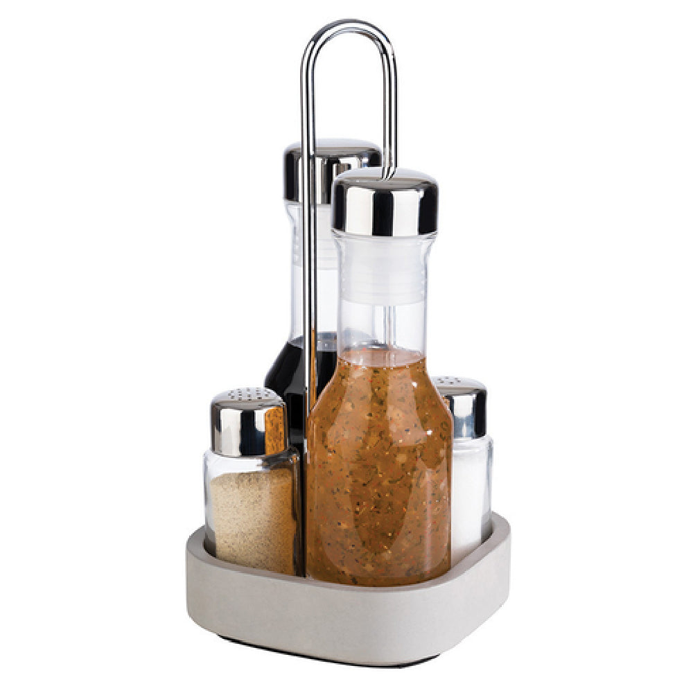 The Libbey APS 40412 Oil & Vinegar Cruet Set is a meticulously crafted 5-piece ensemble, specifically designed to enhance culinary presentation and functionality. Each set includes two 6-3/4 oz. clear glass shakers, distinguished by their stainless steel covers, ensuring durability and a sleek aesthetic. Additionally, the set features two clear glass containers, each equipped with polyethylene non-drip pour spouts and stainless steel covers, providing precision pouring and minimizing mess. These containers are ideal for a variety of oils and vinegars, offering versatility for different culinary needs. The centerpiece of this set is a cruet with a concrete base, which adds a modern and sophisticated touch to any kitchen or dining setting. Measuring 5"L x 5"W x 9-7/8"H, this compact set is perfect for both professional and home environments, offering both functionality and style. As part of the Element collection from APS® Germany, this cruet set reflects a commitment to quality and design excellence. Perfect for restaurateurs, home chefs, or culinary enthusiasts, the Libbey APS 40412 provides a practical and elegant solution for oil and vinegar storage and dispensing.